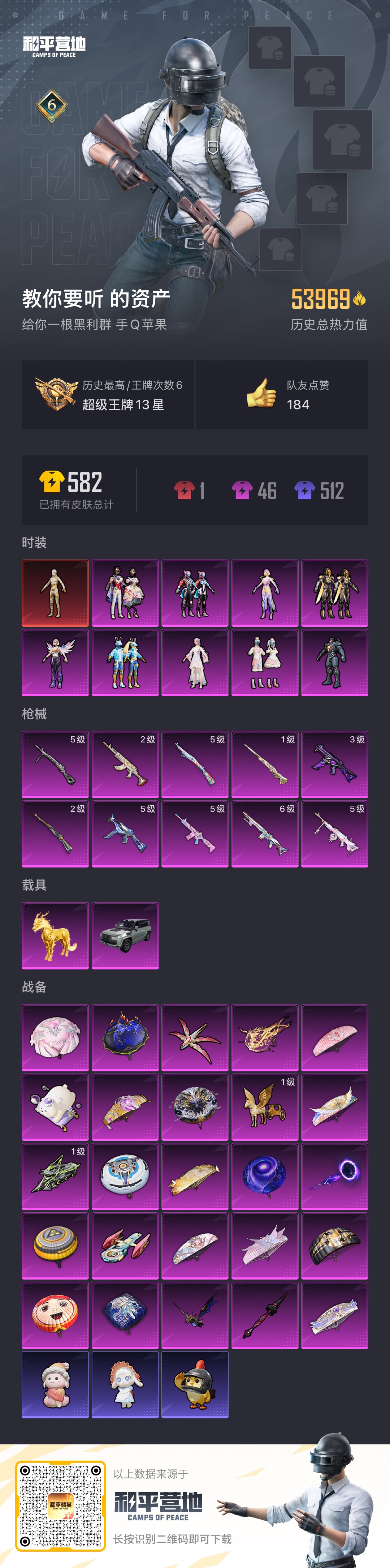 热力值:51786,2神装,10粉装,9粉枪,1载具,24