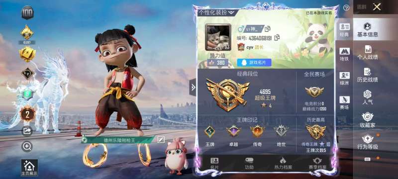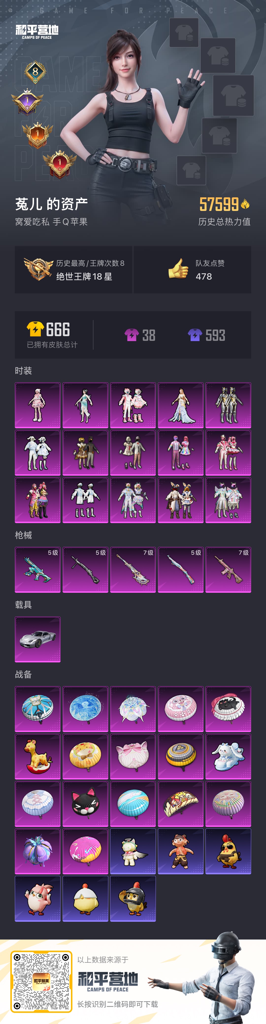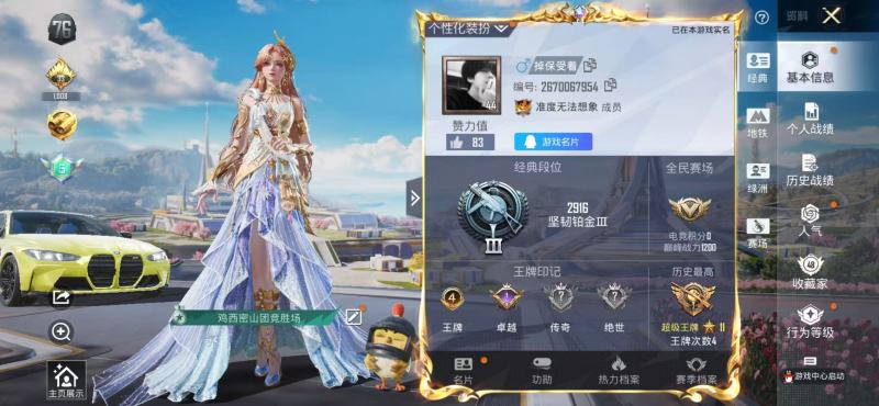 实名: 可修改 时装数: 288 载具数: 4 枪械数: 107 战备数: 6