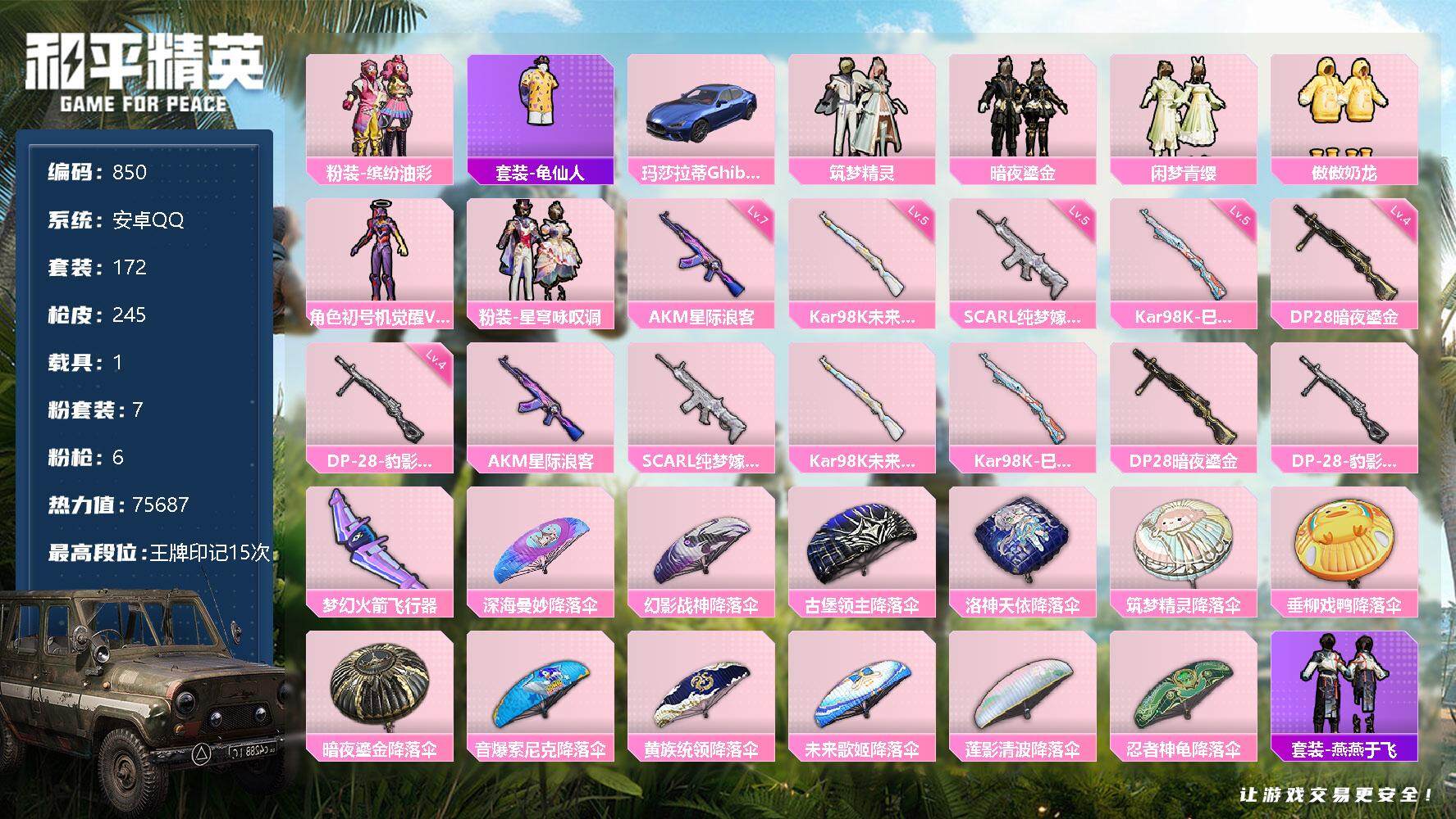 【852】【商品标题】:安卓 手Q-1神装-5粉装-6特效枪-3载具-3粉色飞