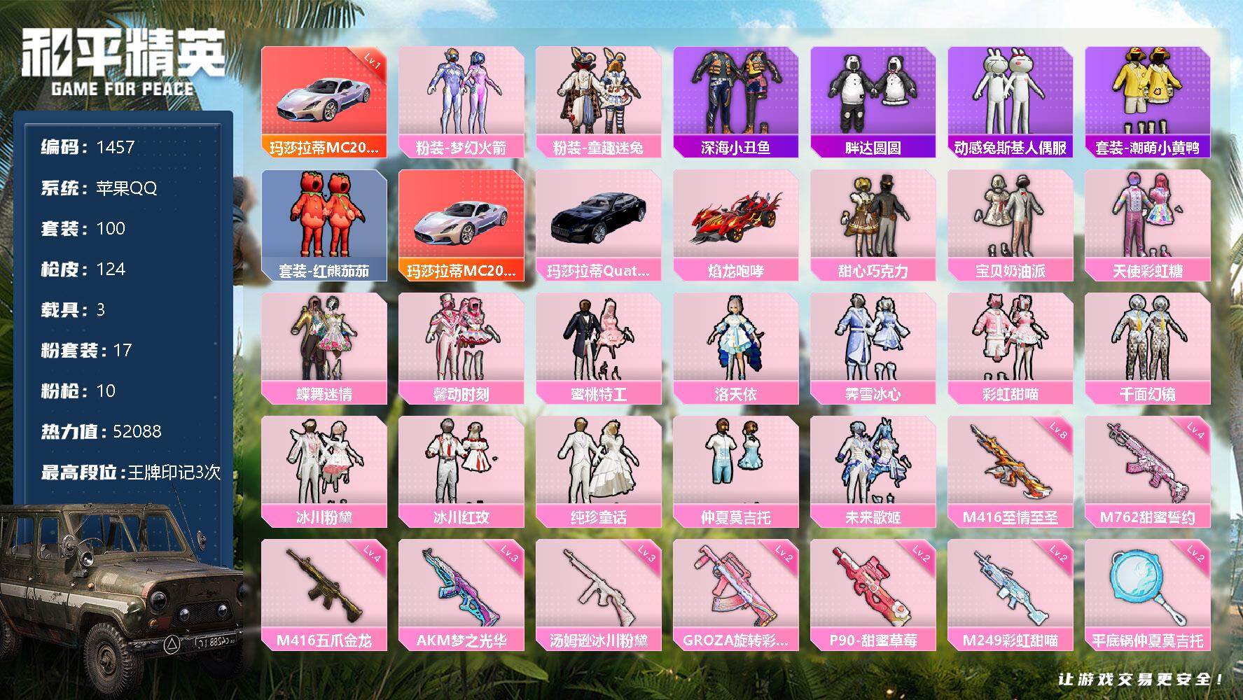 【1488】苹果 手Q-1神装-28粉装-11特效枪-8载具-5粉色飞行器-1