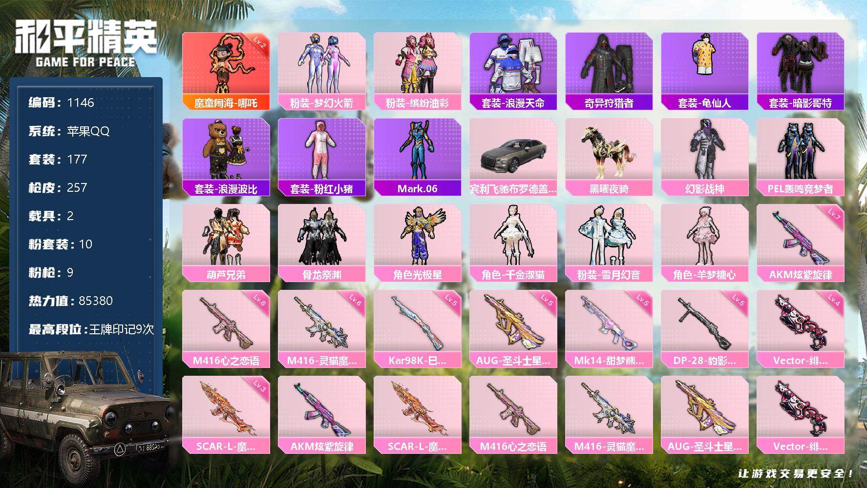 【1146】【商品标题】:苹果 手Q-1神装-10粉装-9特效枪-2载具-5粉