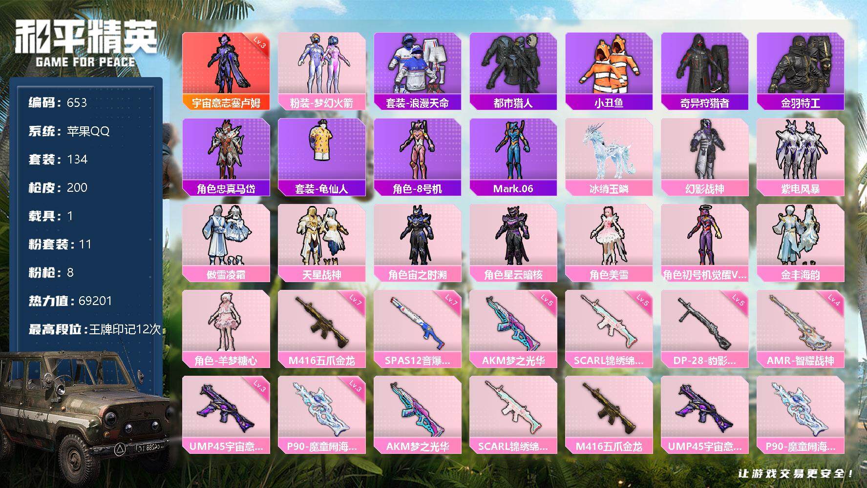 【653】【商品标题】:苹果 手Q-1神装-11粉装-8特效枪-1载具-7粉色
