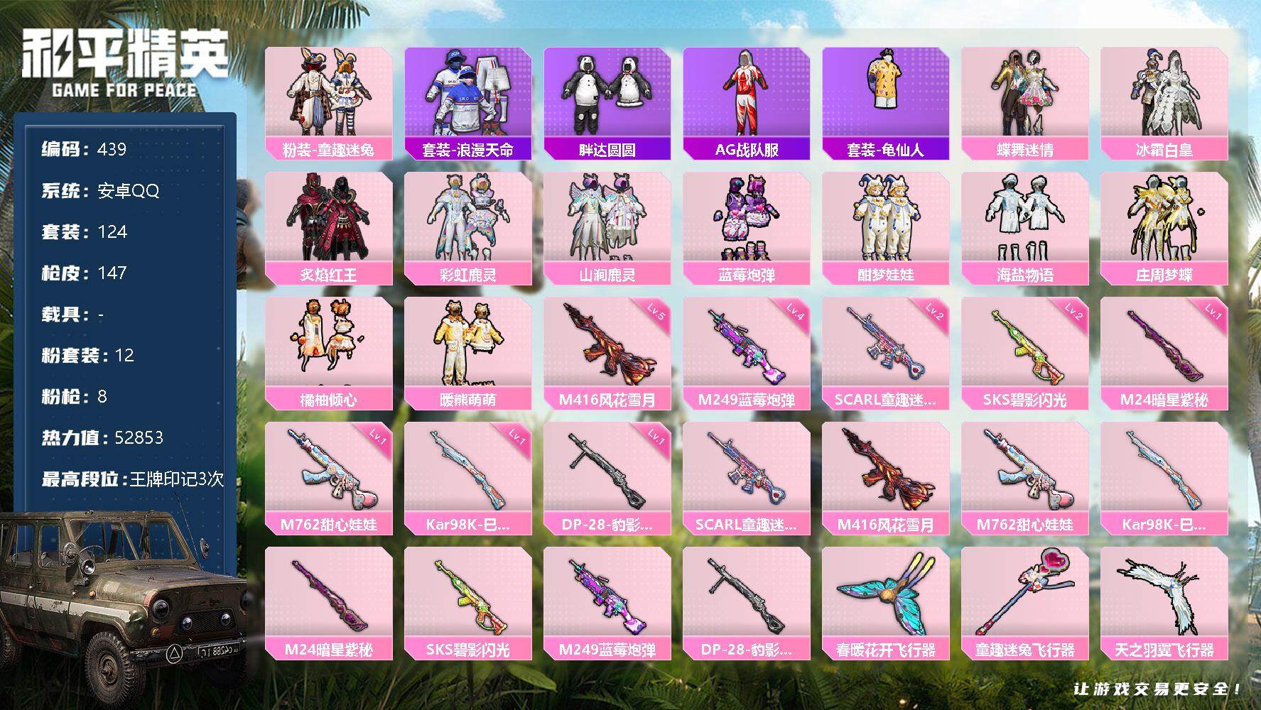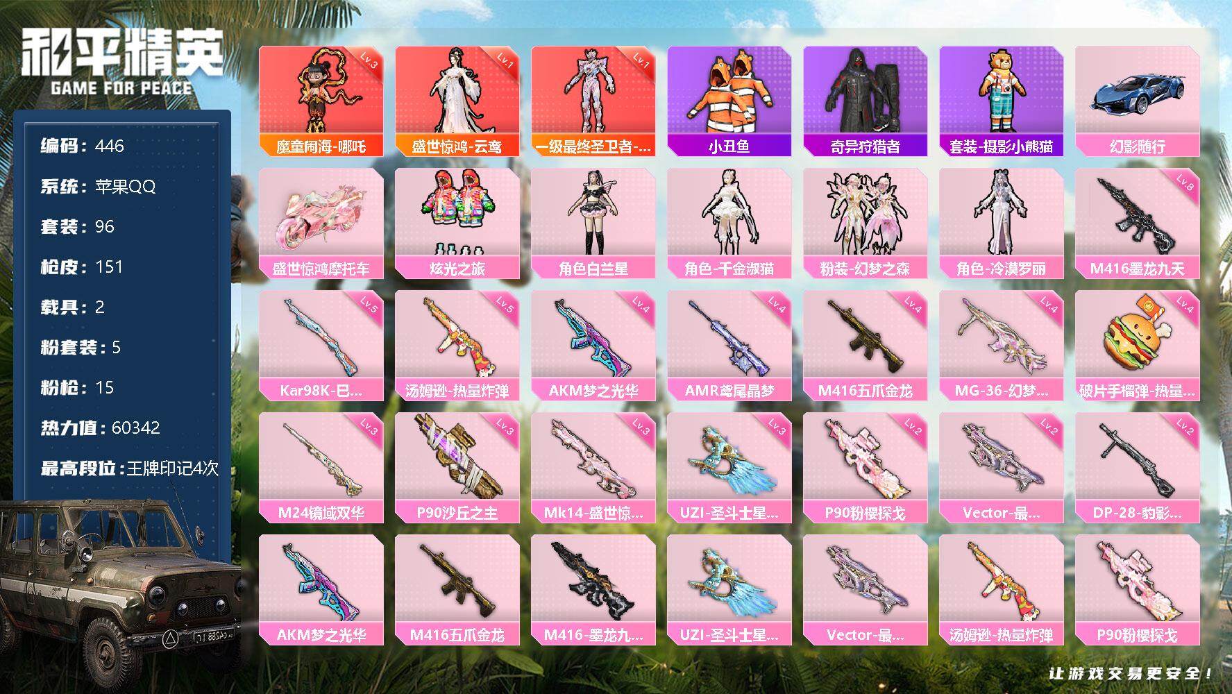 【446】【商品标题】:苹果 手Q-3神装-5粉装-15特效枪-2载具-9粉色
