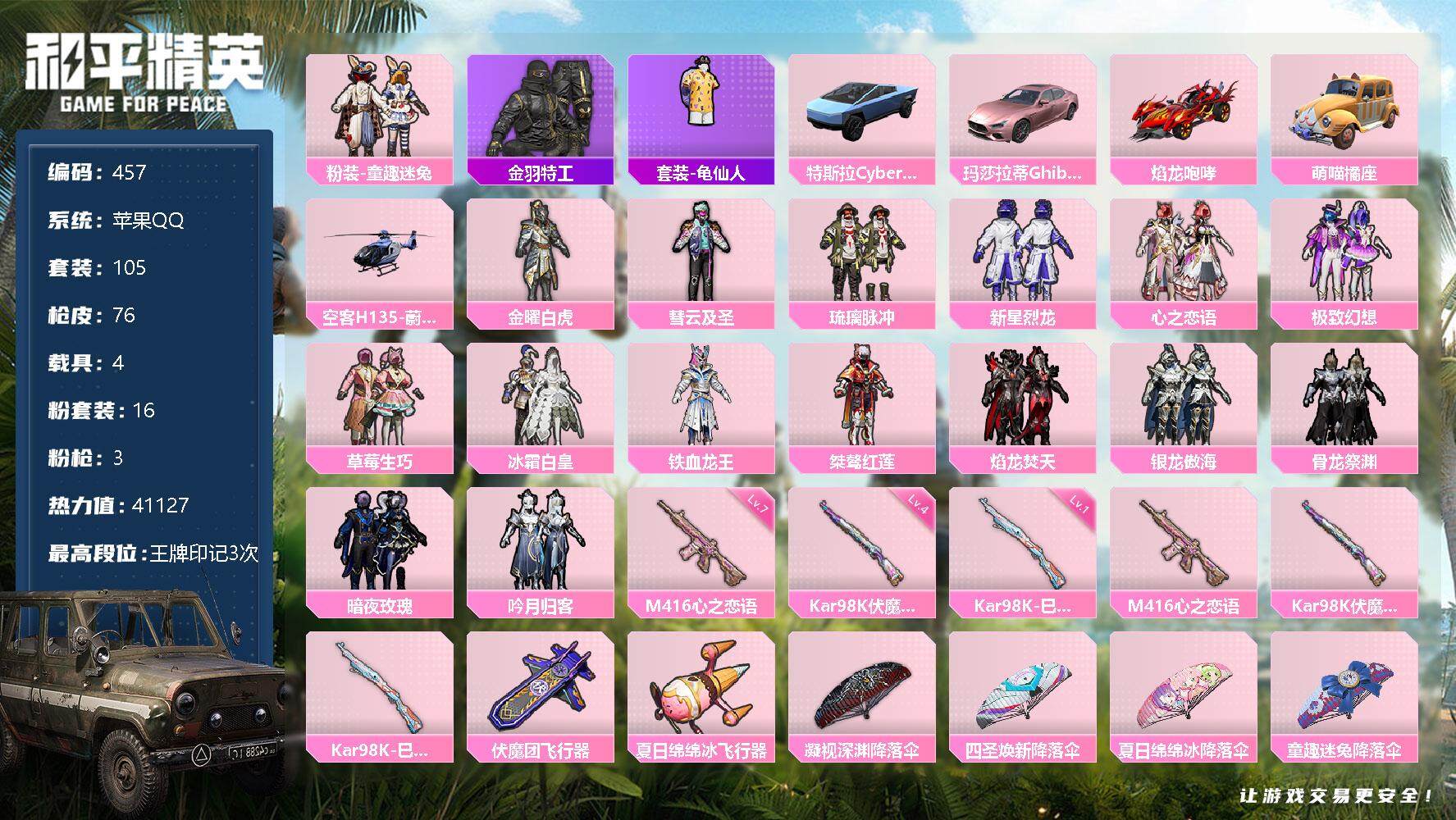 【437】【商品标题】:苹果 手Q-1神装-9粉装-9特效枪-3载具-4粉色飞