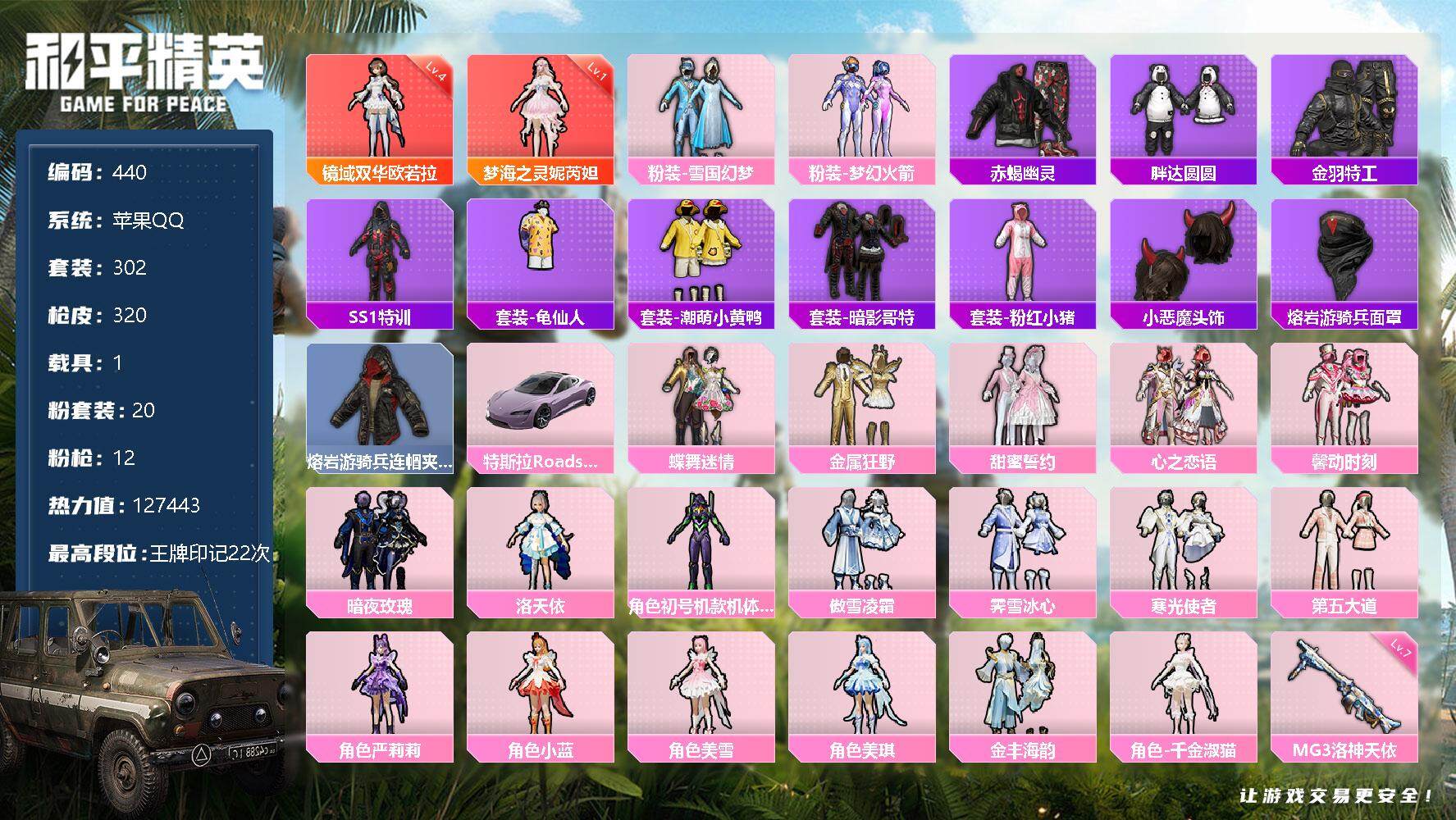 【440】【商品标题】:苹果 手Q-2神装-20粉装-12特效枪-1载具-7粉