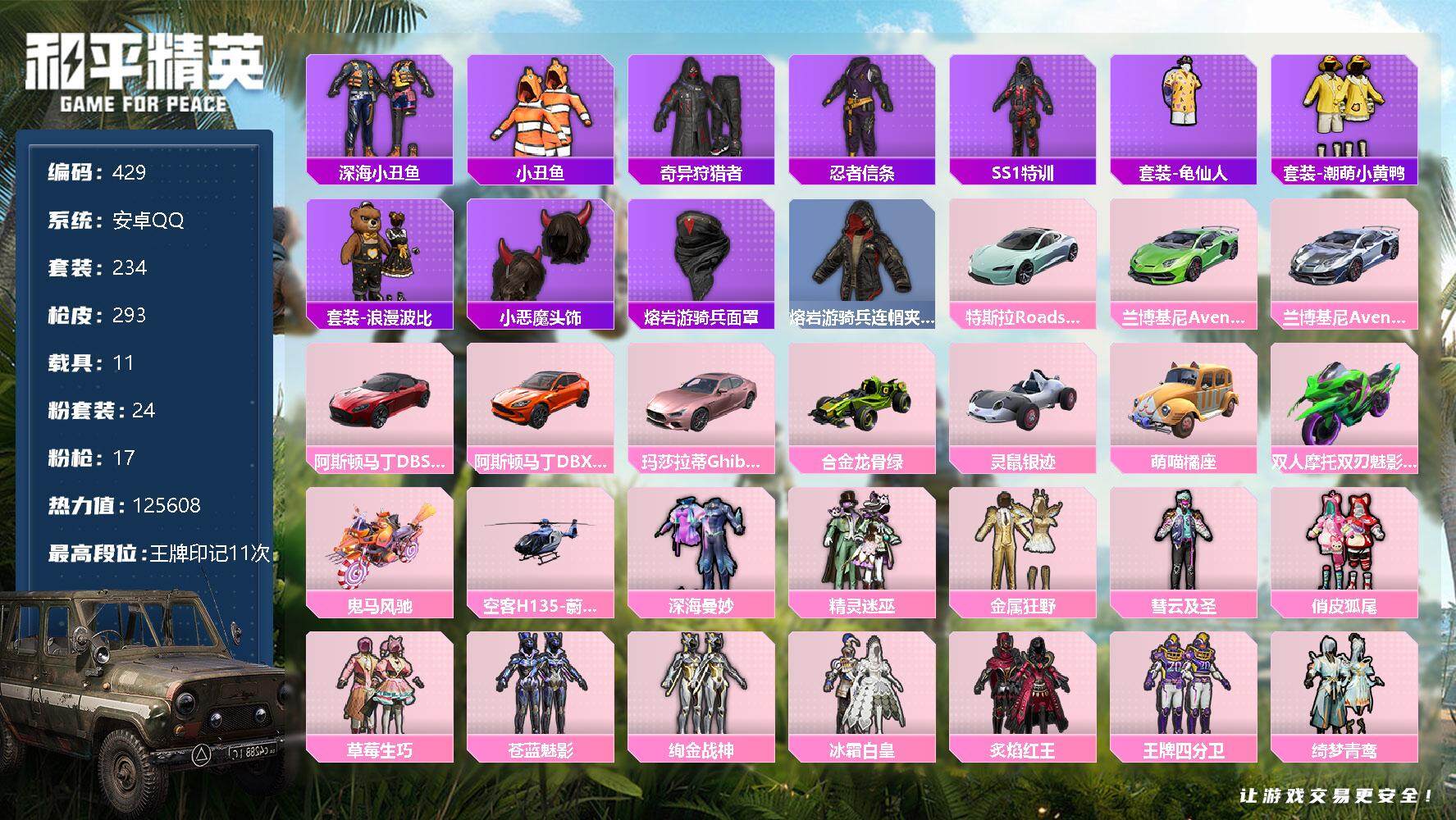 【431】【商品标题】:安卓 手Q-1神装-12粉装-10特效枪-3载具-3粉