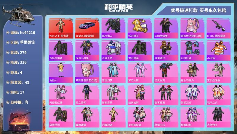 hs44216 苹果微-15王牌印记-有战神框-43粉装-17特效枪-4载具-163181热力值-