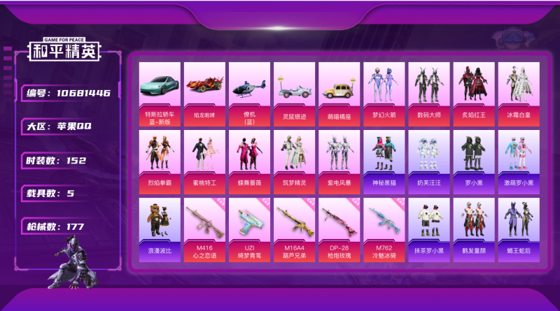 苹果 手Q-4粉装-6特效枪-0载具-2粉色飞行器-52486热力值-8王牌印