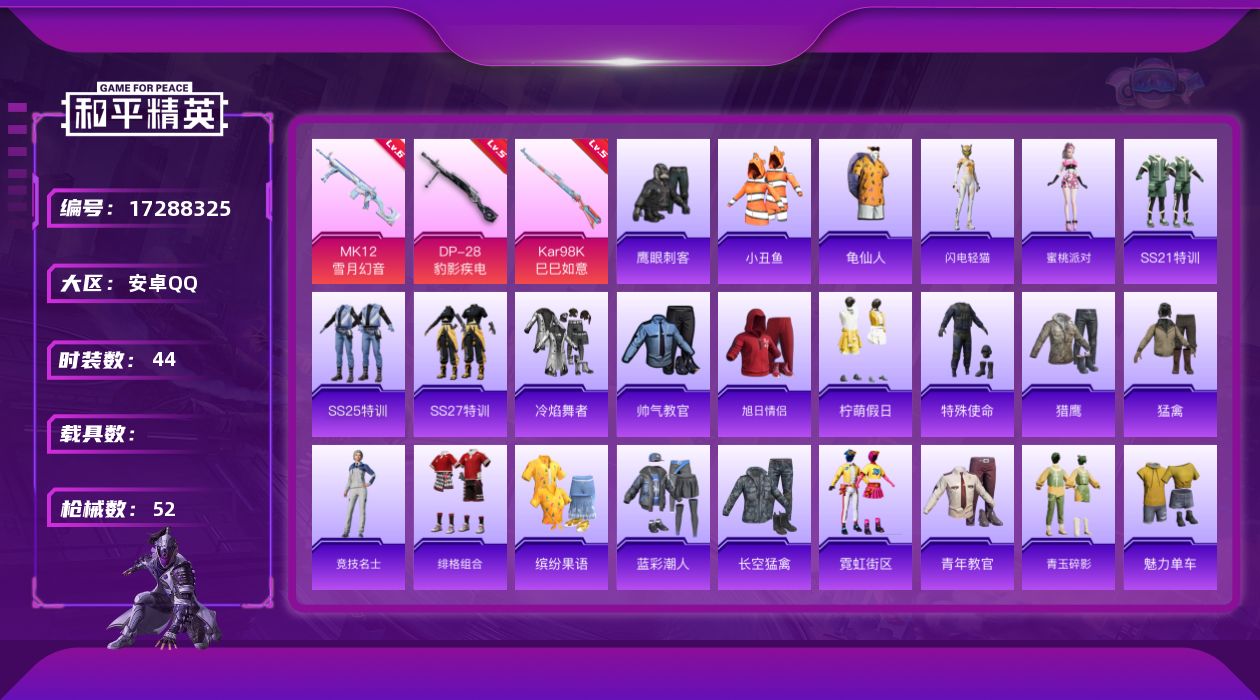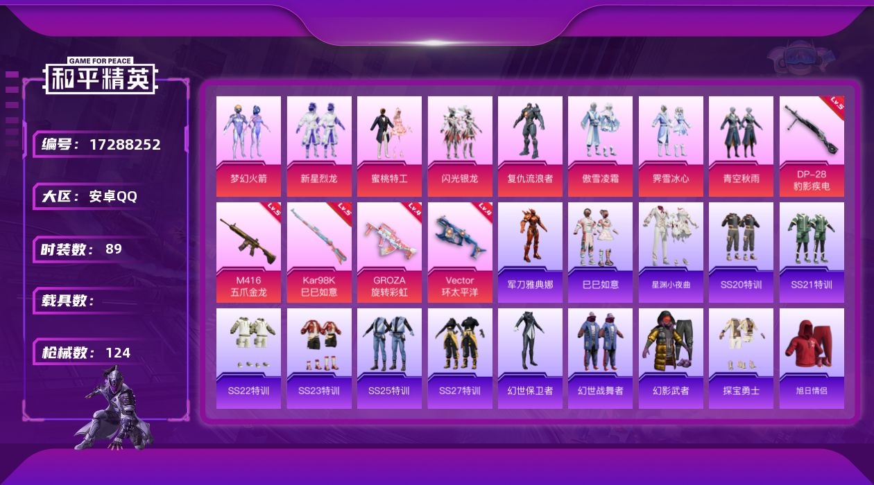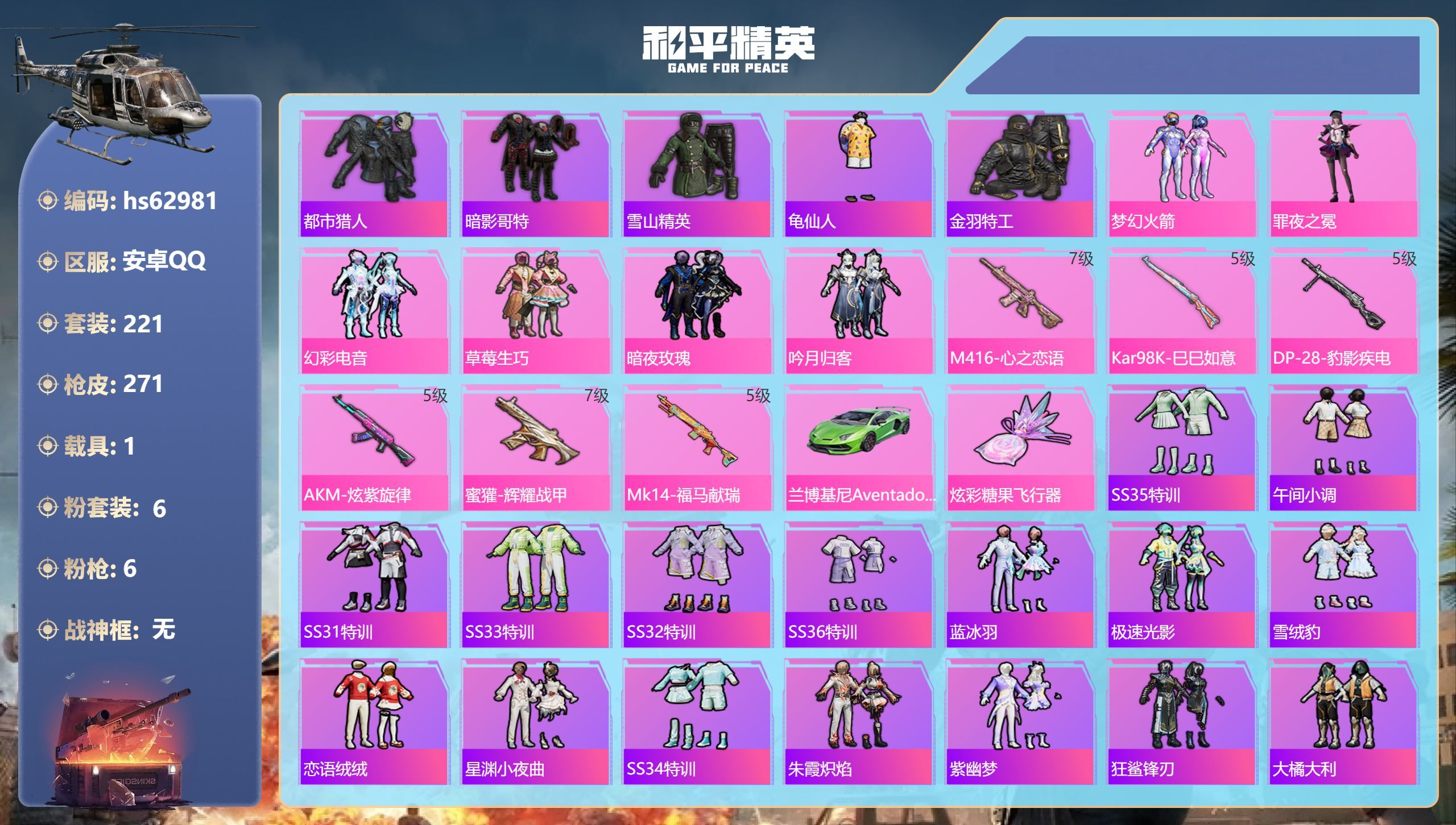 hs62981 安卓手Q-18王牌印记-6粉装-6特效枪-1载具-83954热力值-221套装-27