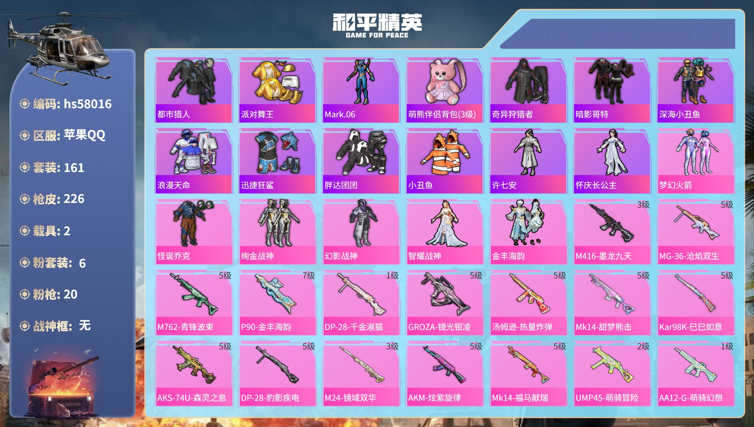 hs58016 苹果手Q-8王牌印记-6粉装-20特效枪-2载具-70558热力值-161套装-22