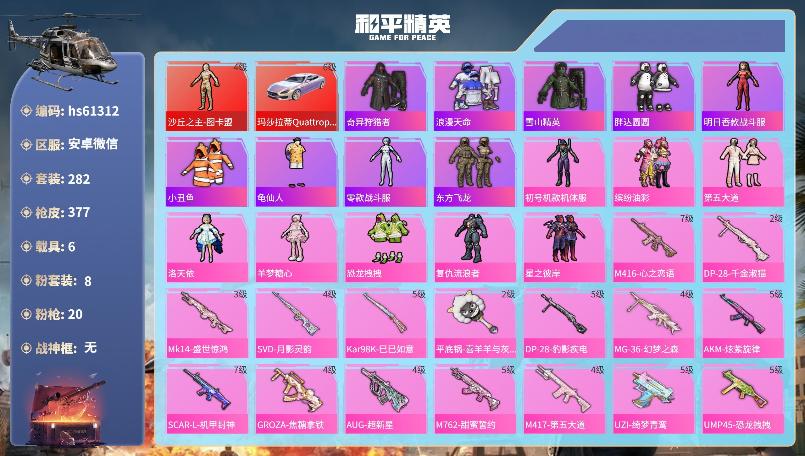 hs61312 安卓微-34王牌印记-1红装-8粉装-20特效枪-6载具-136621热力值-28