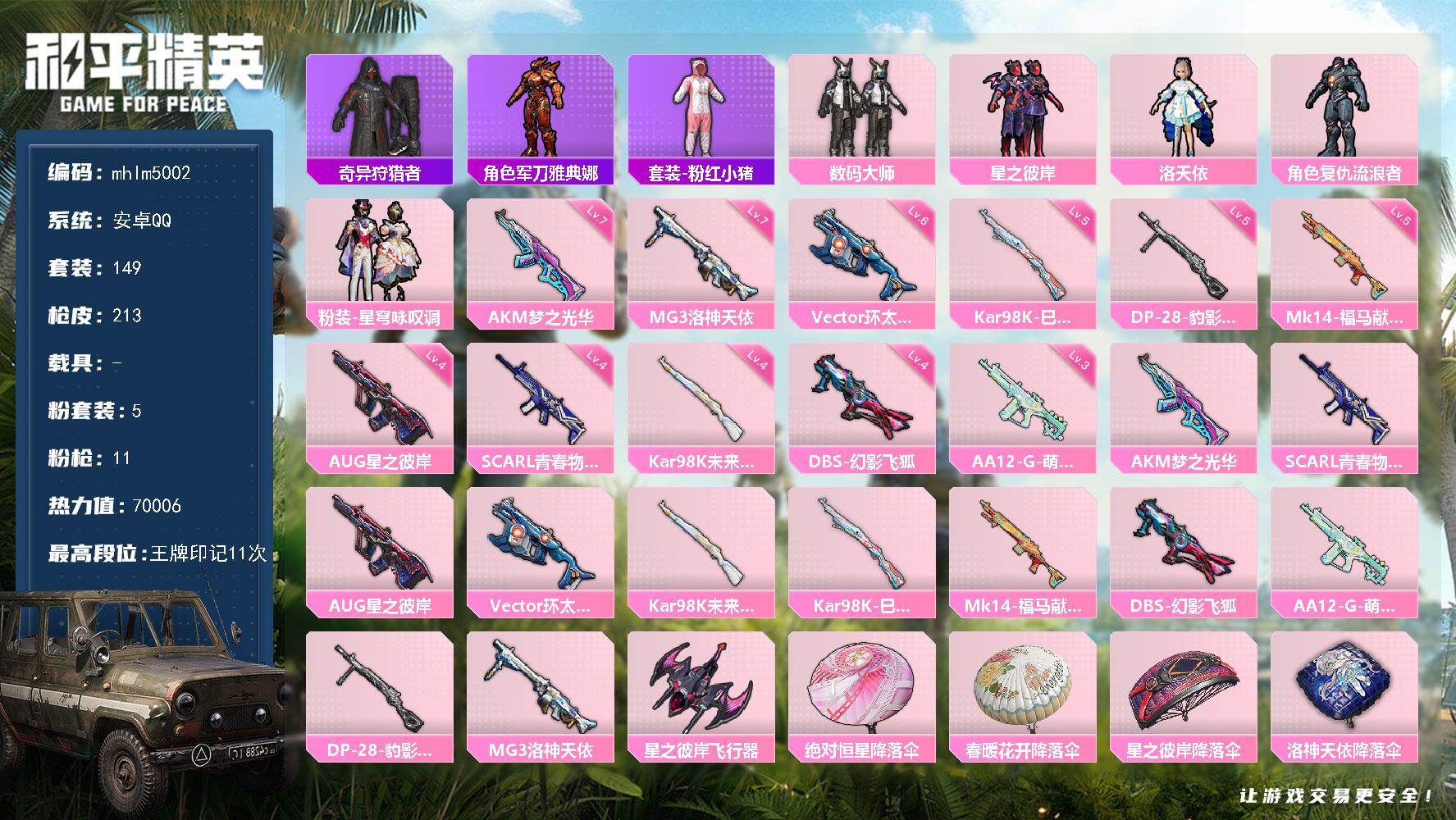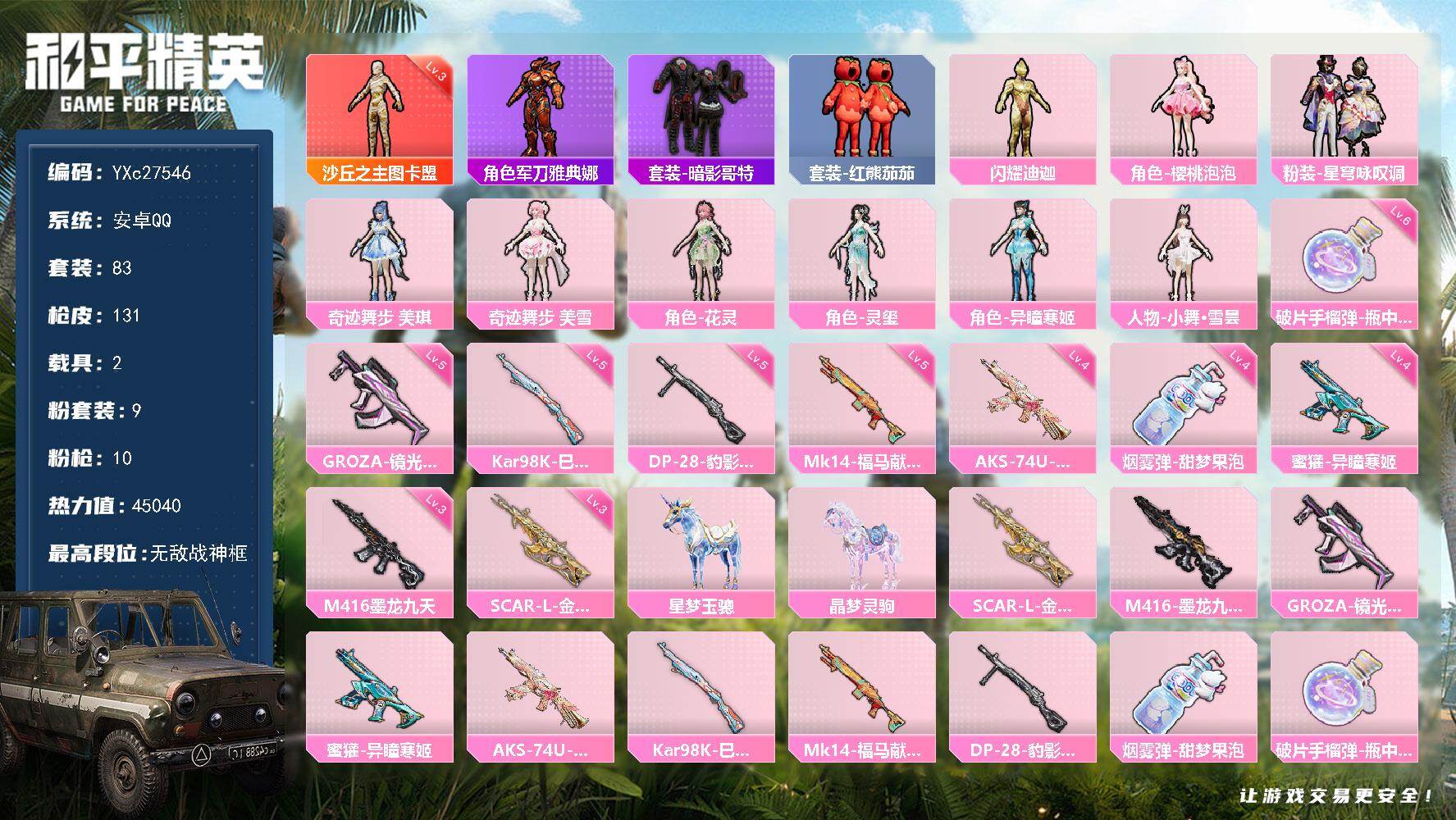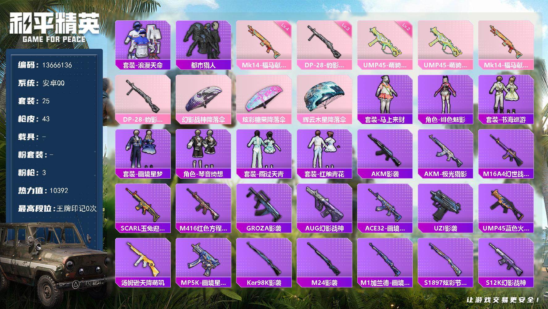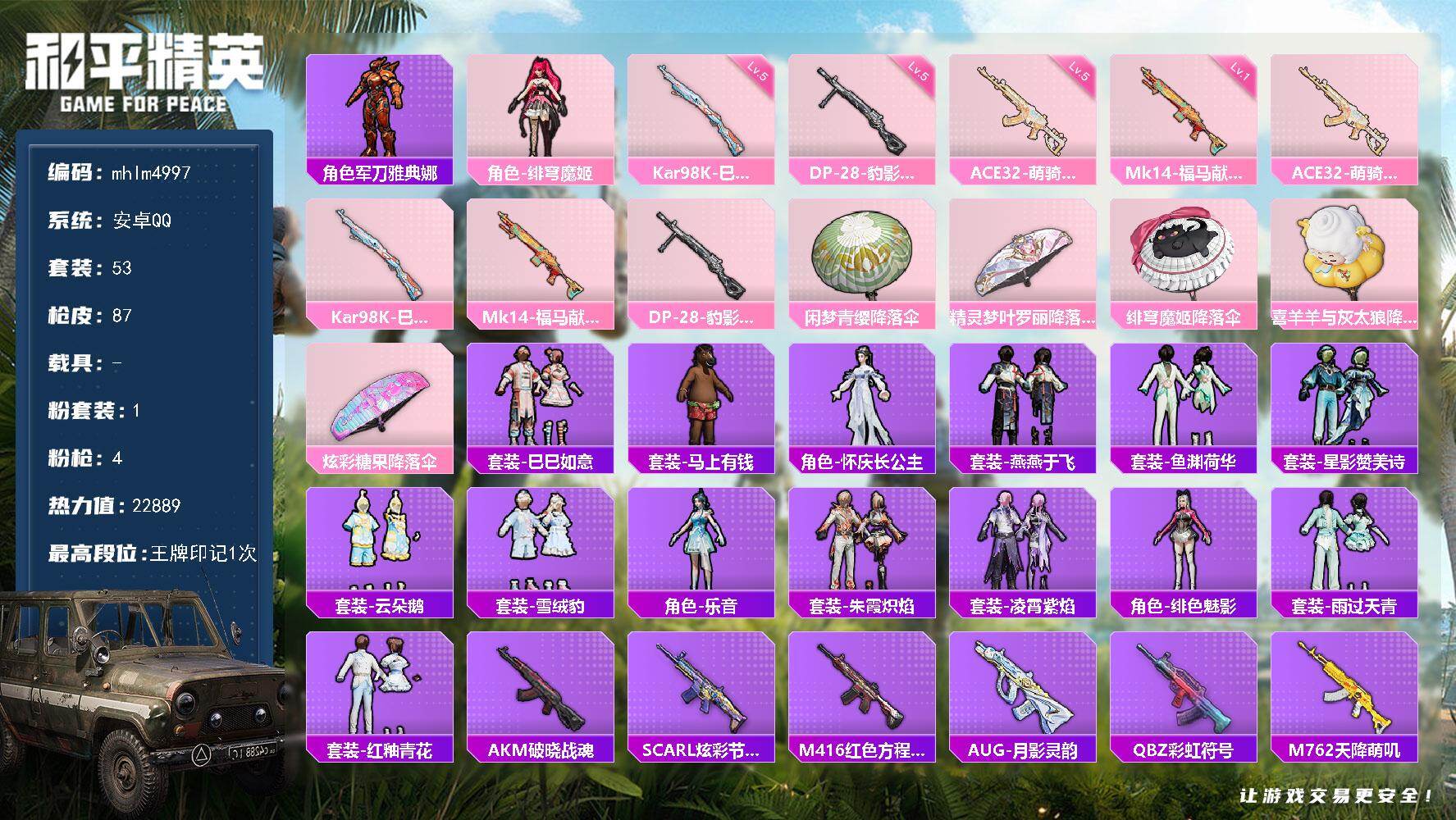 可二次实名【5特效枪 秒换绑不用等】 安卓Q区-8426热力值-15套装-34枪