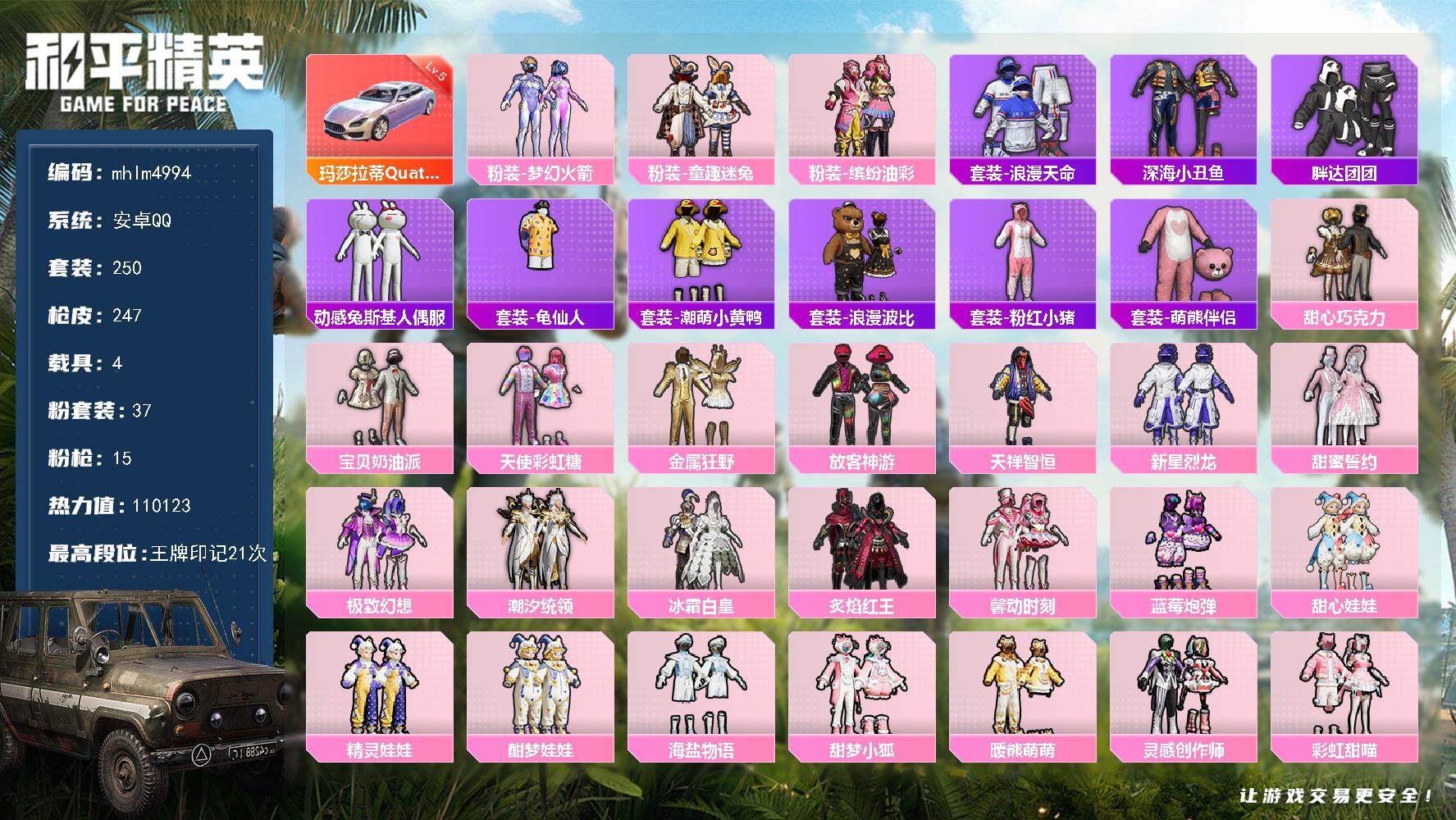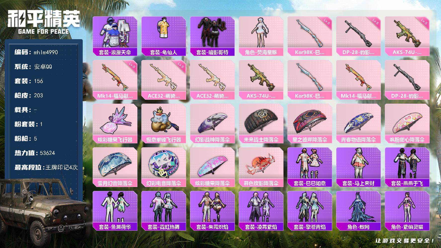 【mhlm4995】安卓 手Q-1神装-7粉装-16特效枪-1载具-4粉色飞行