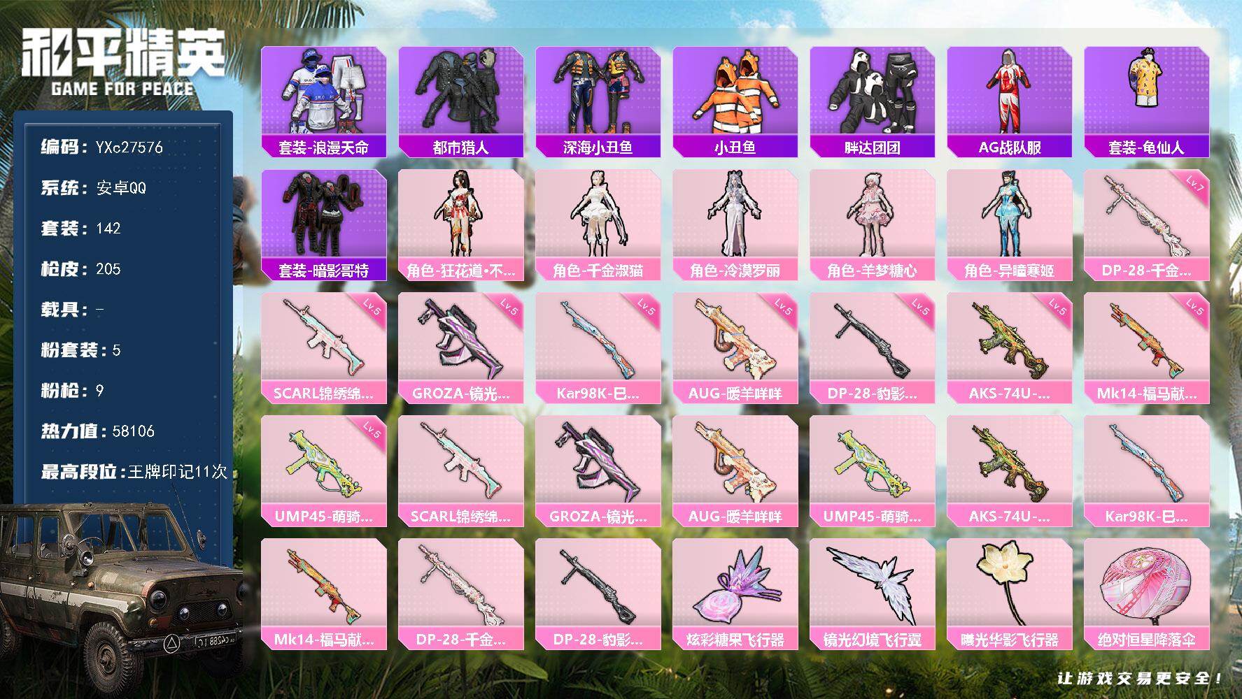 安卓 手Q-4粉装-6特效枪-0载具-2粉色飞行器-56904热力值-11王牌印