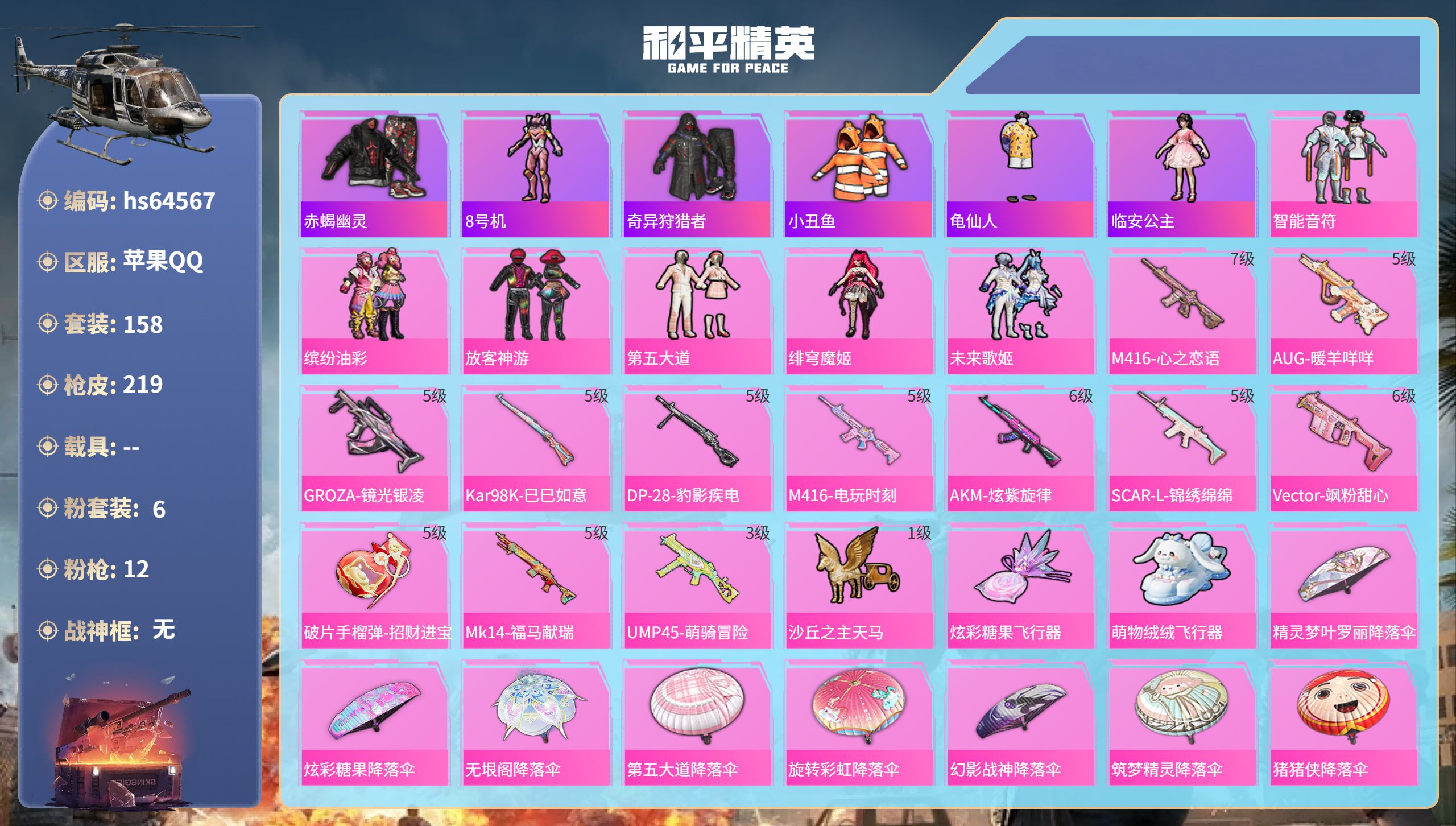 二五零二二一零_可二次-苹果Q-1红装8稀有3载具33粉装35特效枪26热门