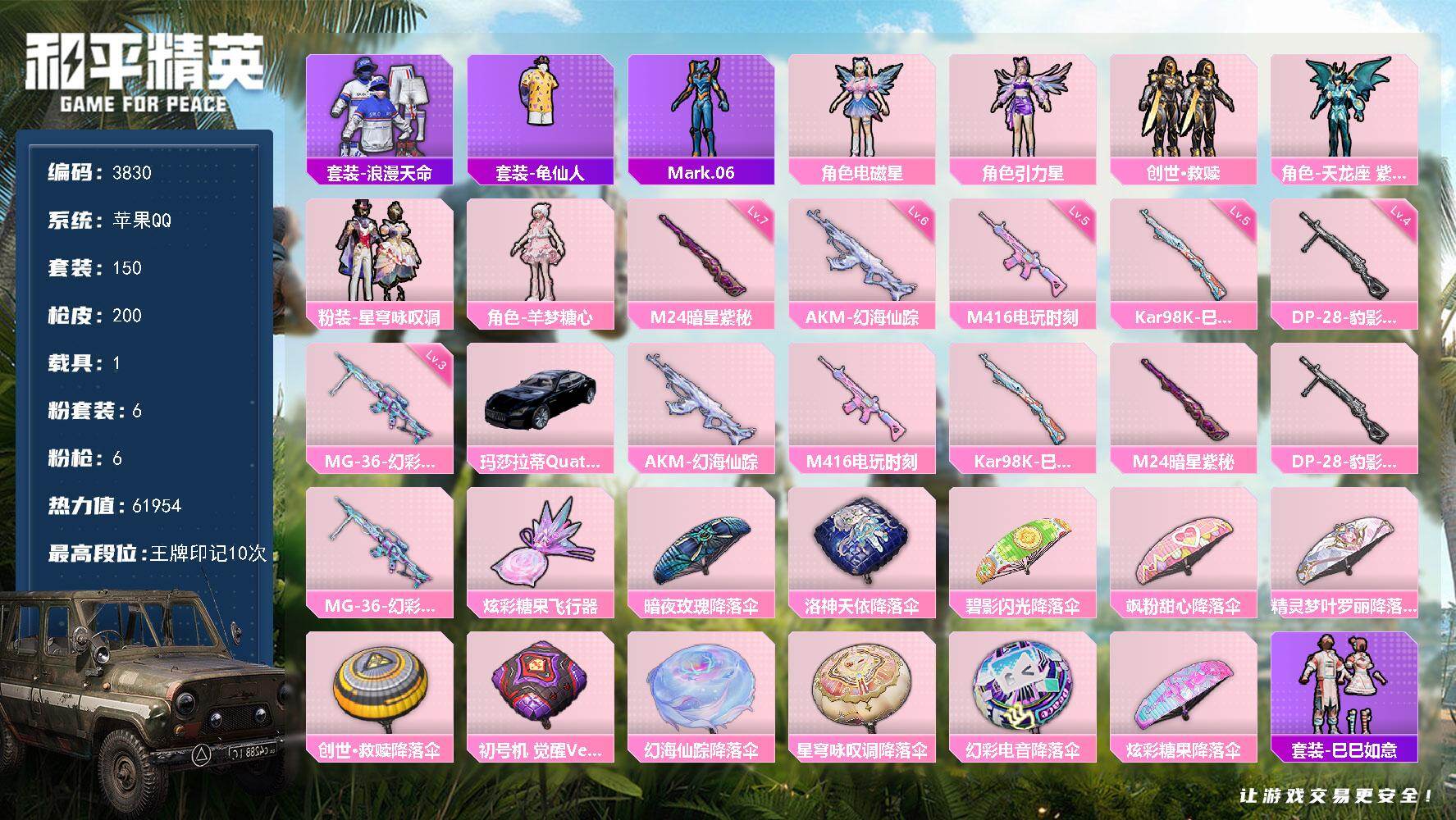 苹果 手Q-6粉装-6特效枪-1载具-2粉色飞行器-61954热力值-10王牌印