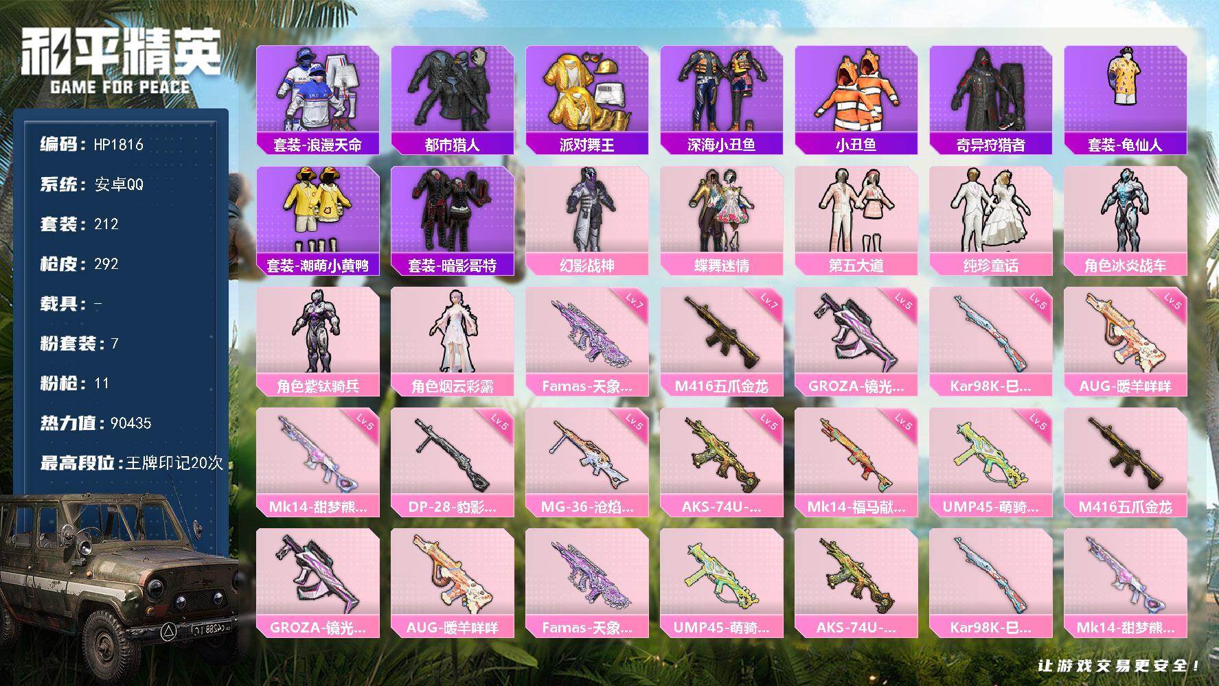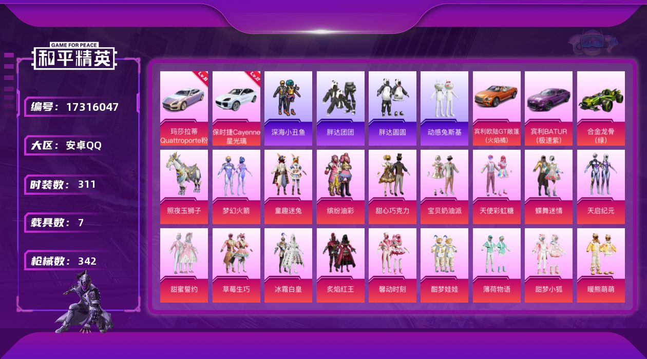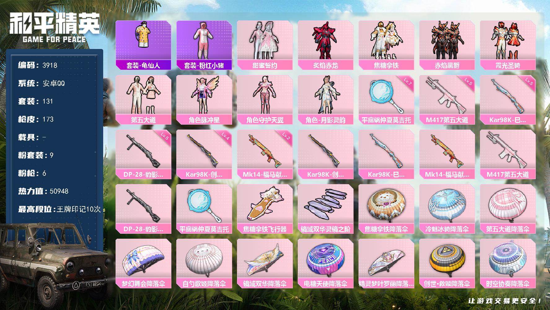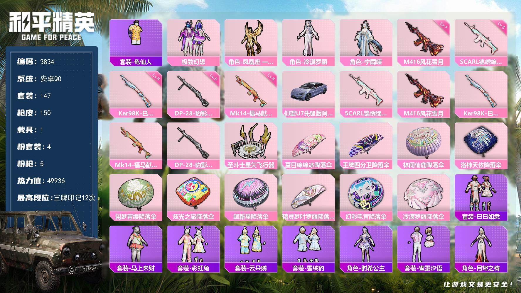 安卓 手Q-4粉装-5特效枪-1载具-1粉色飞行器-49936热力值-12王牌印