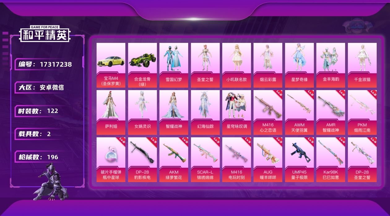 微信小号,只绑定了手机号,樱桃泡泡全套,一套粉装,五把升级枪,其他看图