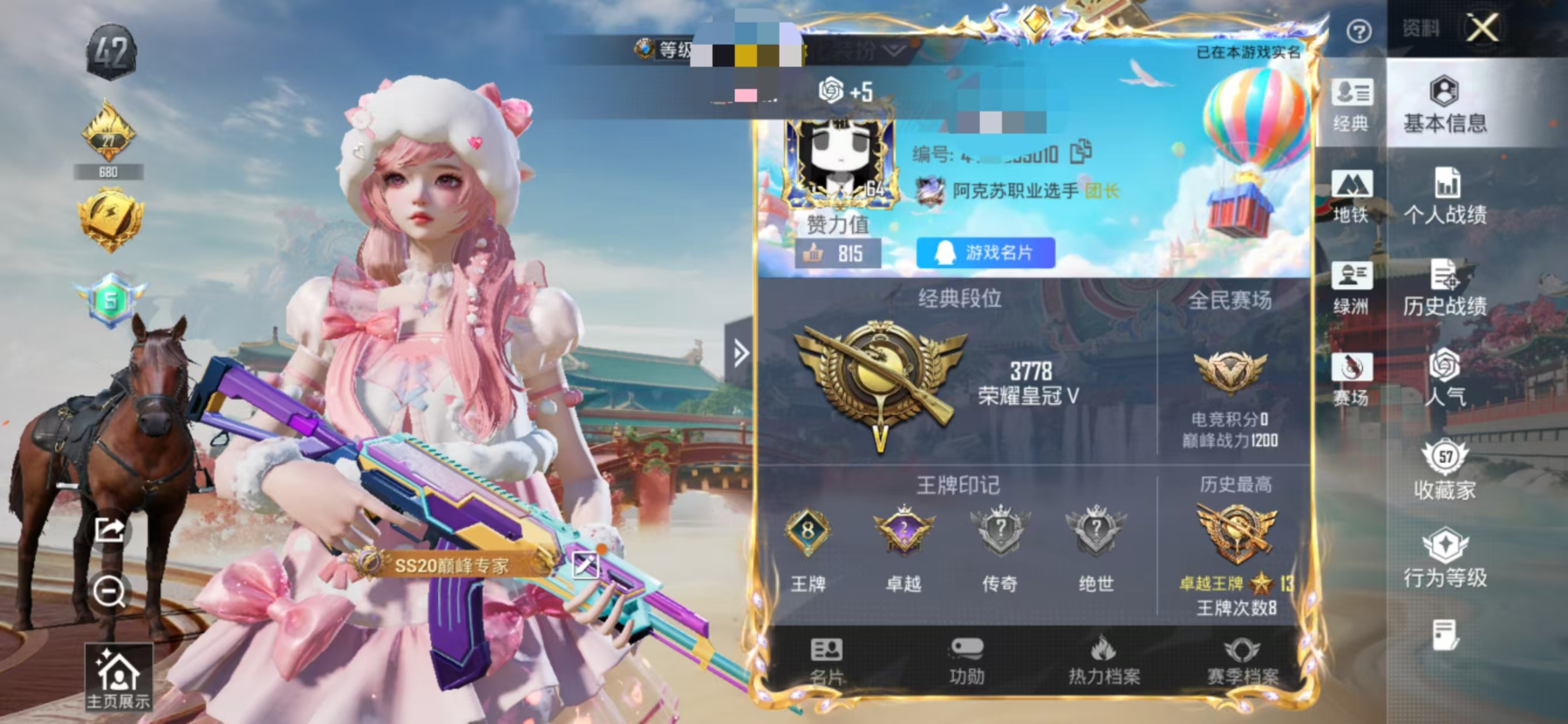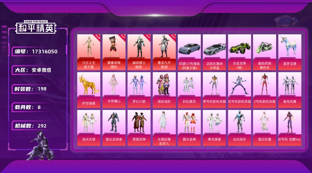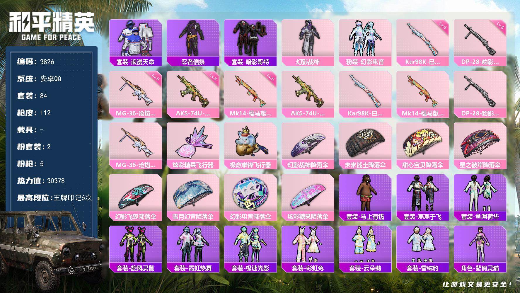 安卓 手Q-2粉装-5特效枪-0载具-2粉色飞行器-30378热力值-6王牌印记