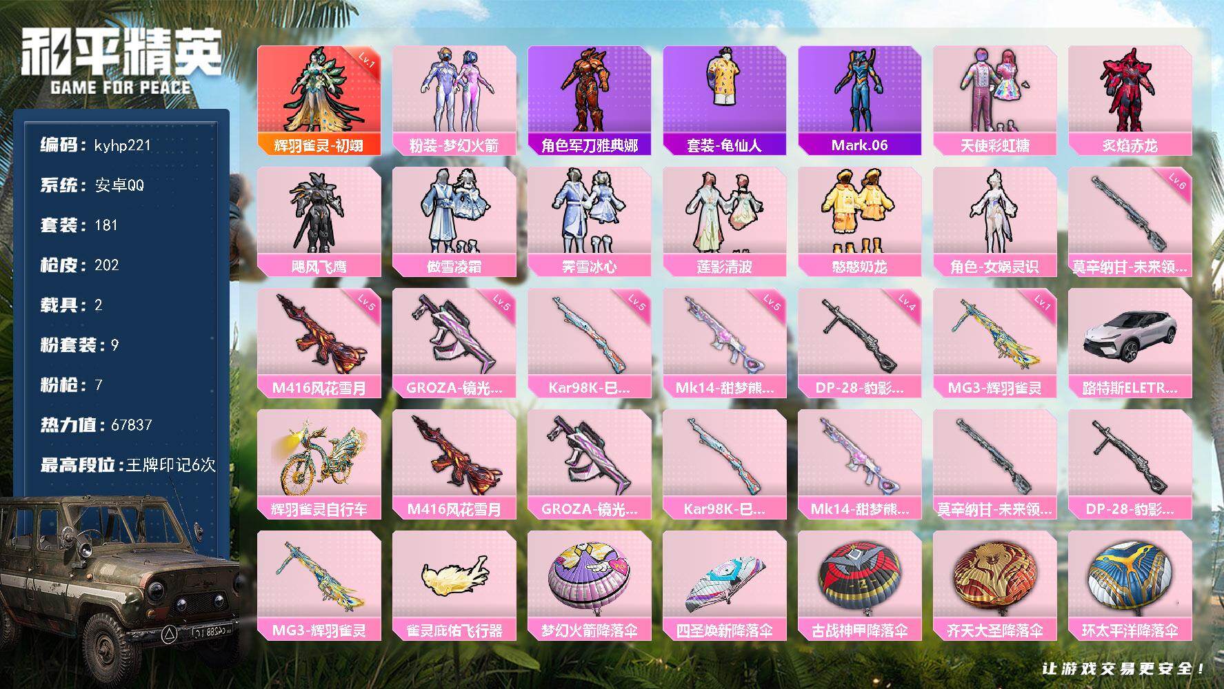 安卓 手Q-9粉装-5特效枪-0载具-2粉色飞行器-65580热力值-10王牌印