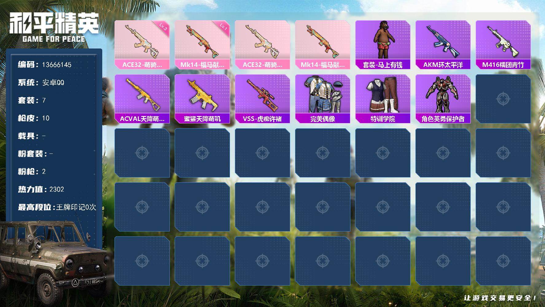 7套装/枪械2/装备11/战备12/热力值2302/三级ACE32-萌骑漫游/