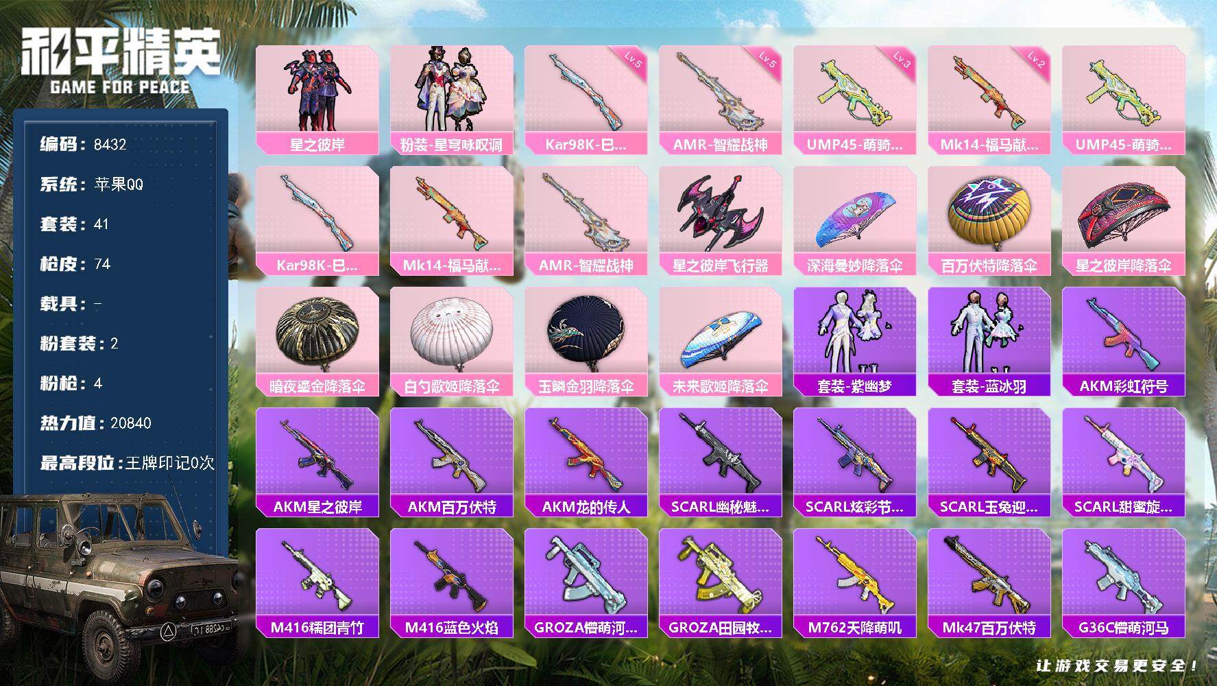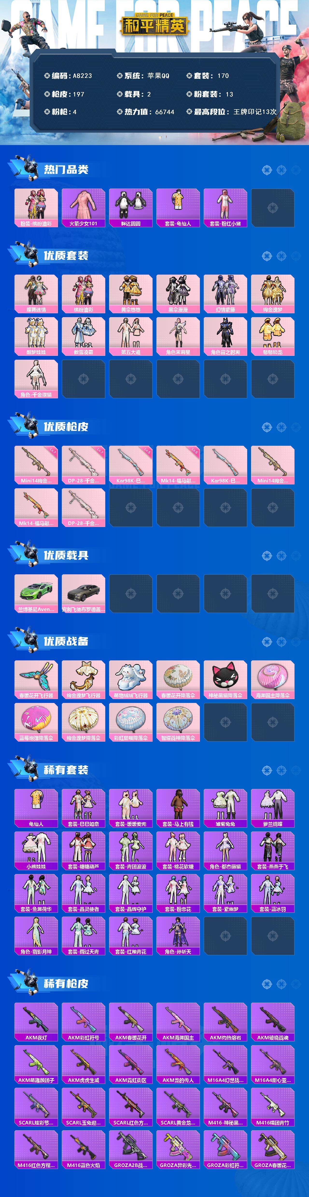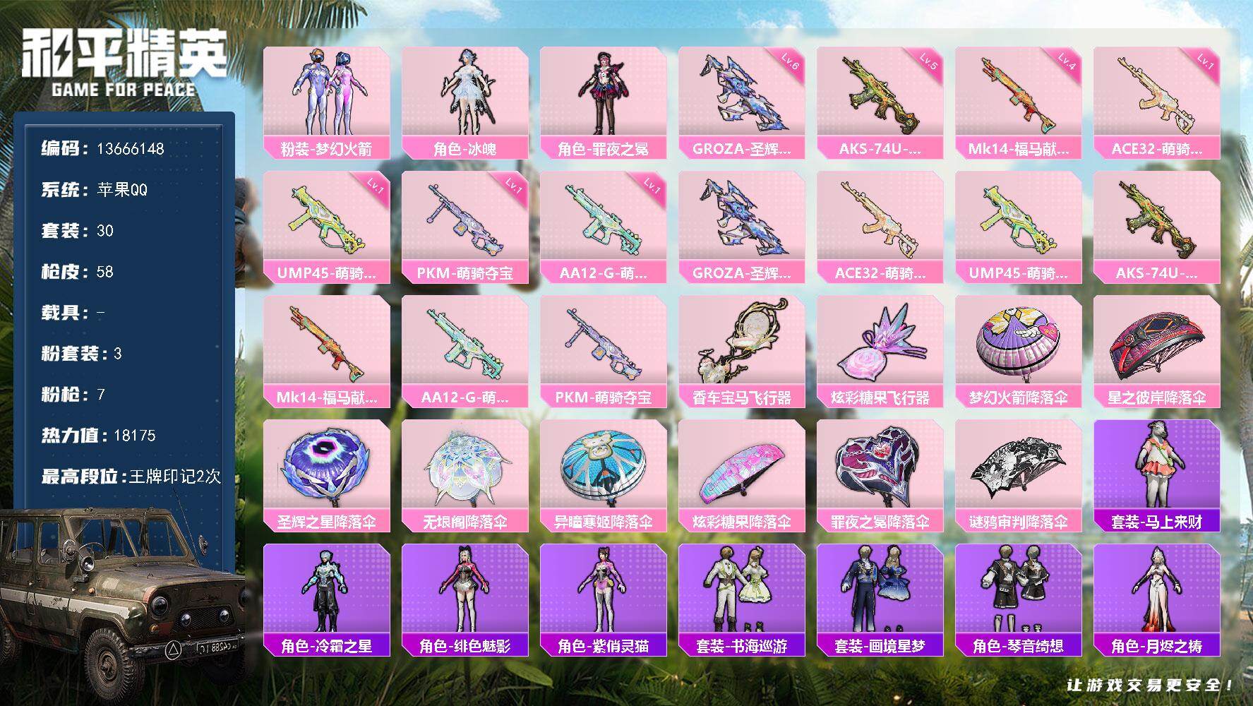 13粉装-4特效枪-2载具-3粉色飞行器-66744热力值-13王牌印记-170套装-197枪皮