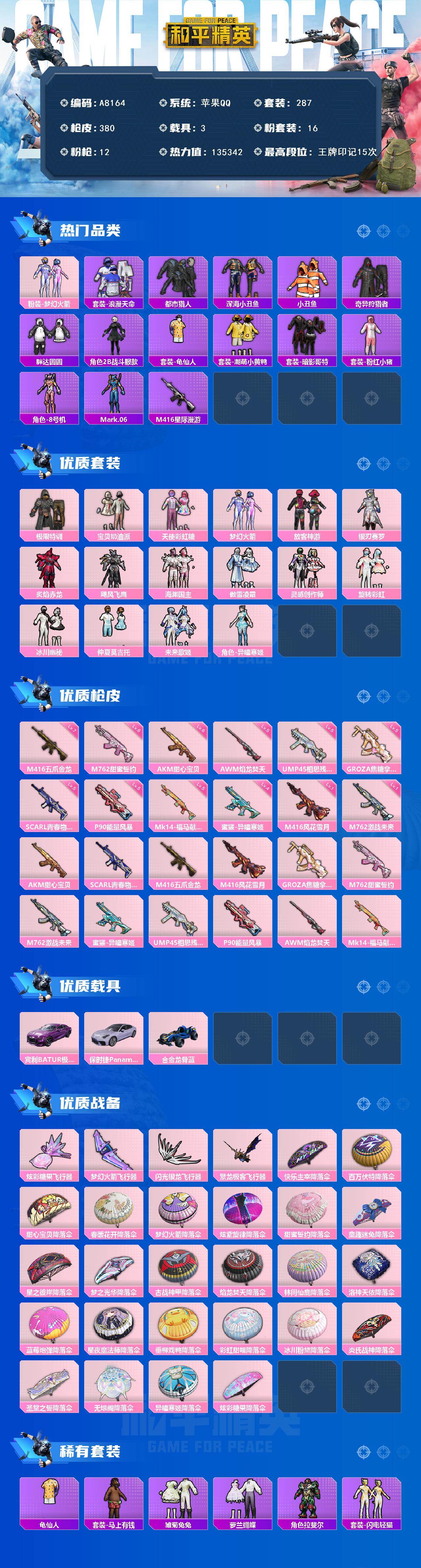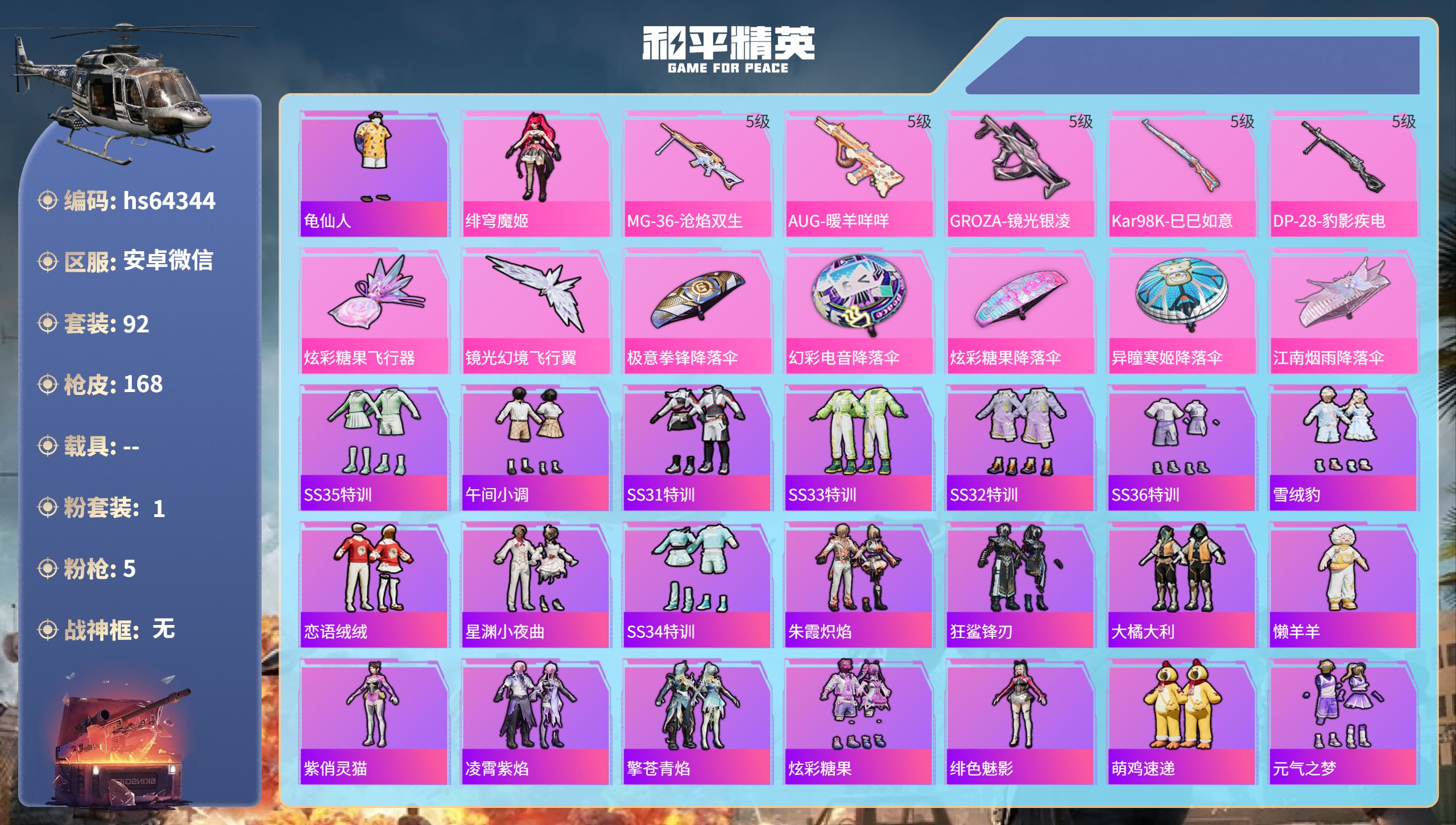 16粉装-12特效枪-3载具-4粉色飞行器-135342热力值-15王牌印记-287套装-380枪皮