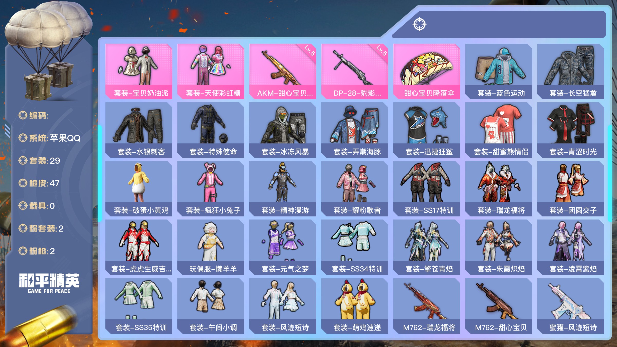 和平精英【苹果QQ】热力值:13245,2粉装,2粉枪,1粉色战备,29套装,