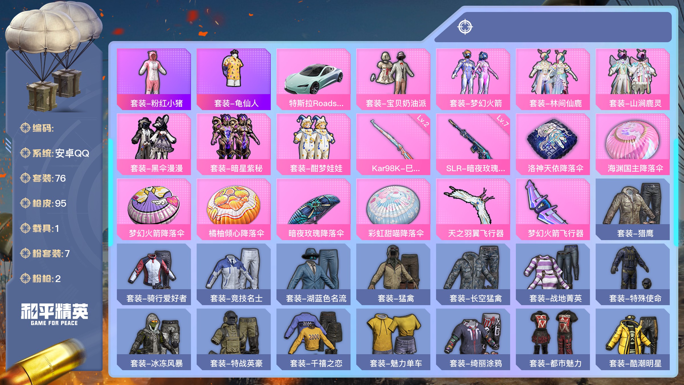 和平精英【安卓QQ】热力值:33421,2粉枪,5载具,3粉色战备,100套装