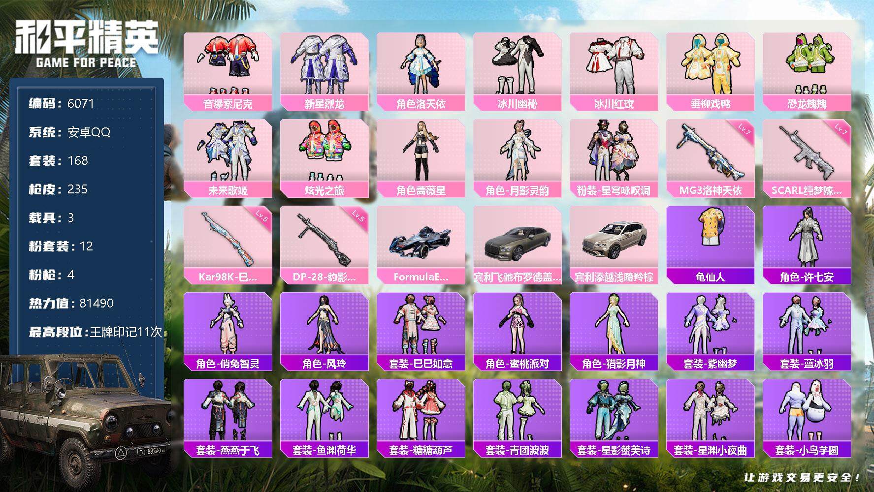 和平精英【安卓QQ】【6071】12粉装-4特效枪-3载具-81490热力值-11印记-168套装