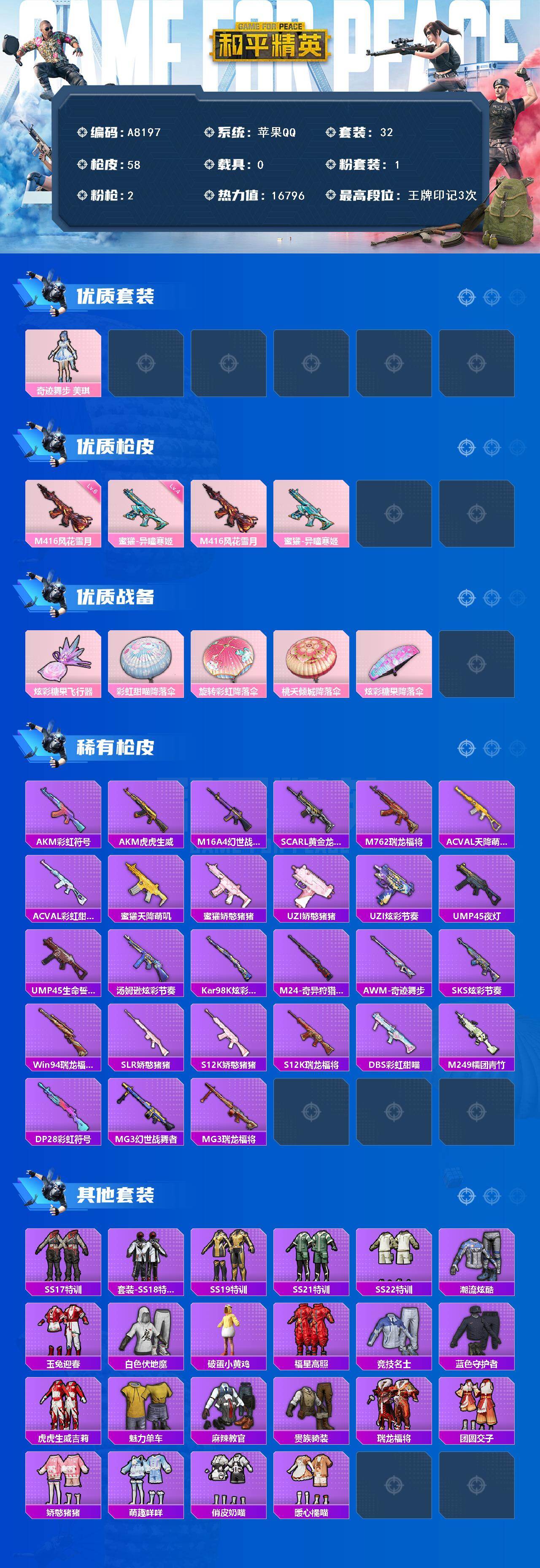 1粉装-2特效枪-0载具-1粉色飞行器-16796热力值-3王牌印记-32套装-58枪皮