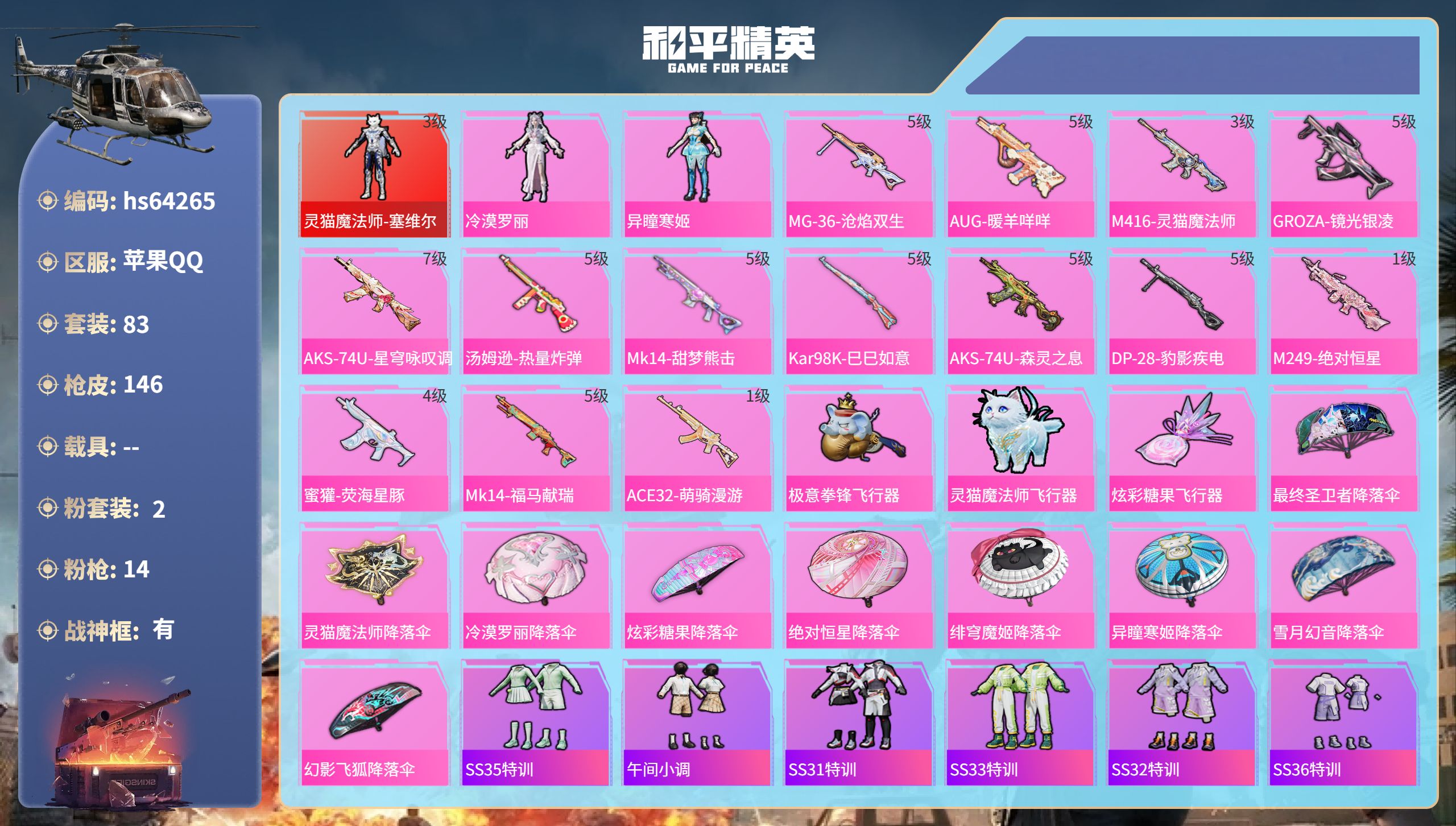 1神装-11粉装-13特效枪-1载具-8粉色飞行器-96535热力值-12王牌印记-245套装-296枪皮