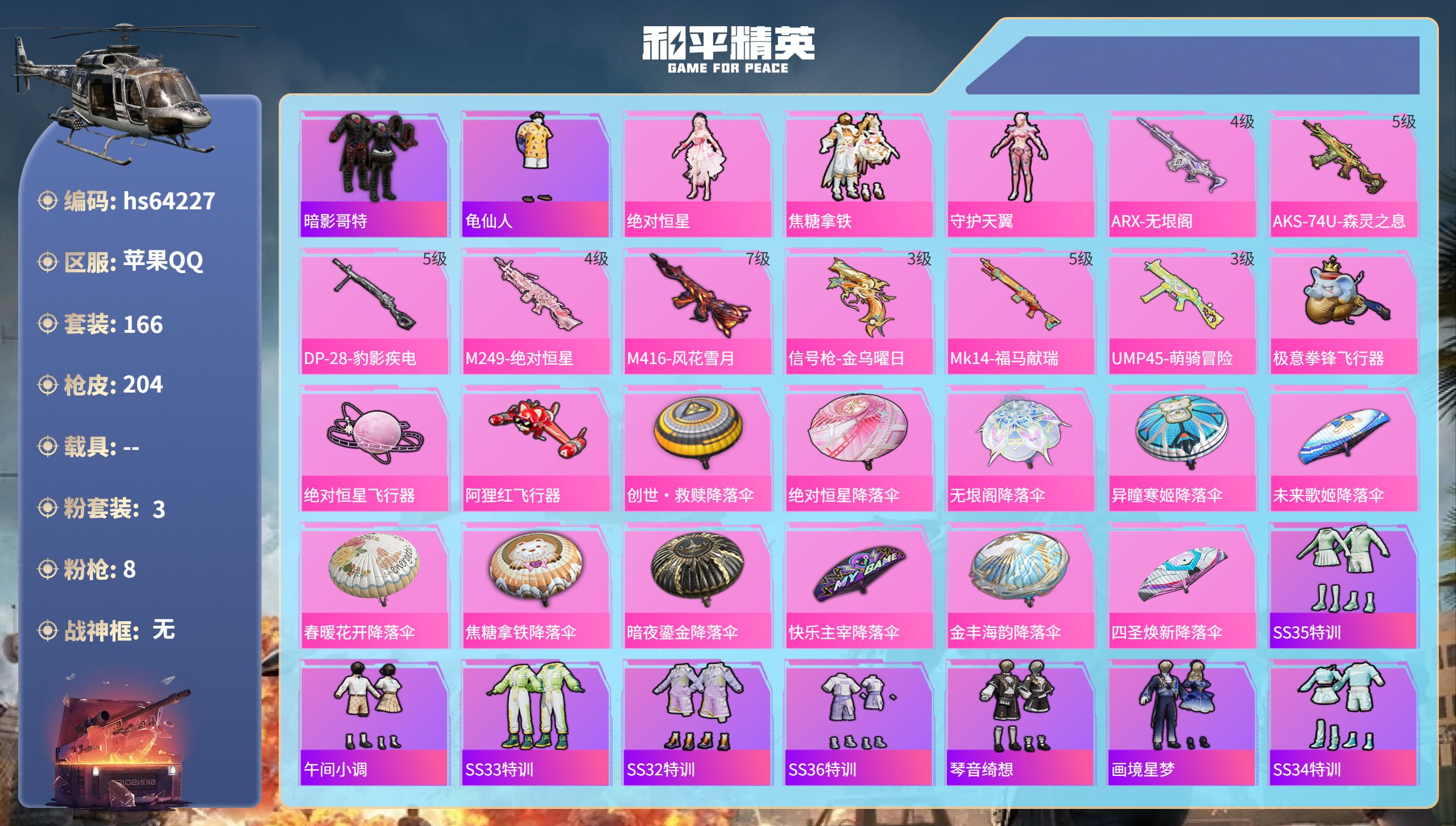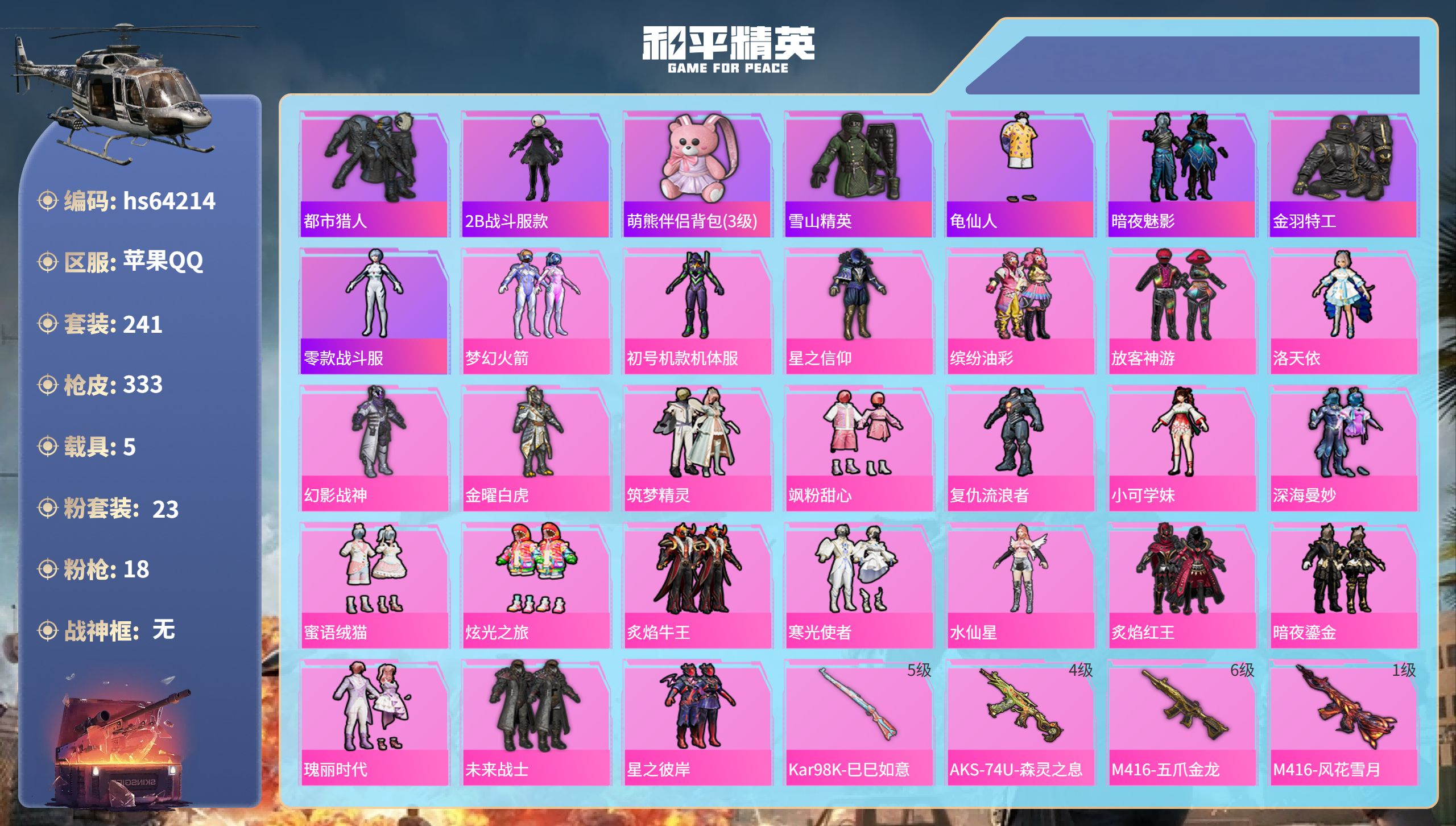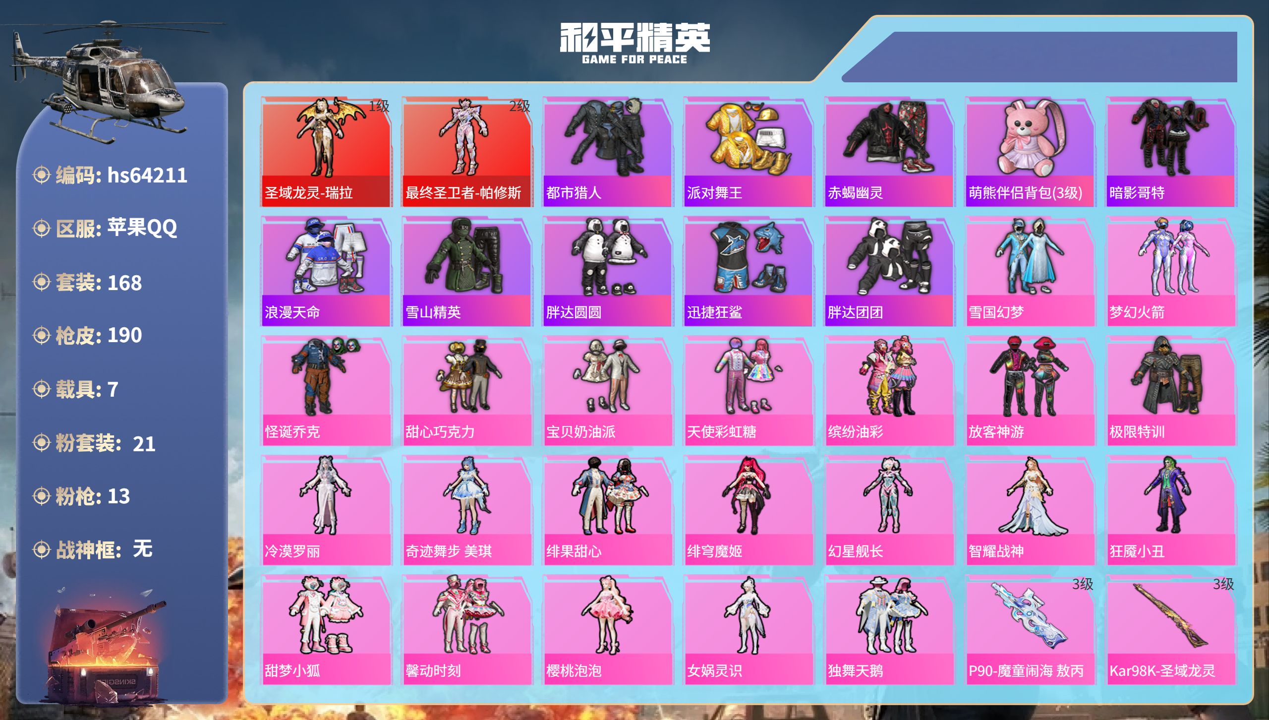 无敌战神框-1神装-12粉装-12特效枪-2载具-4粉色飞行器-71976热力值-16王牌印记-157套装-193枪皮