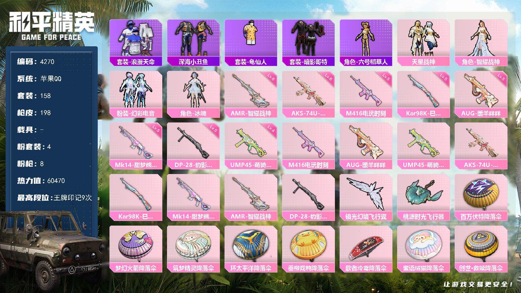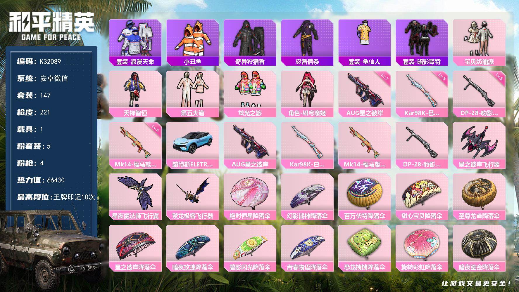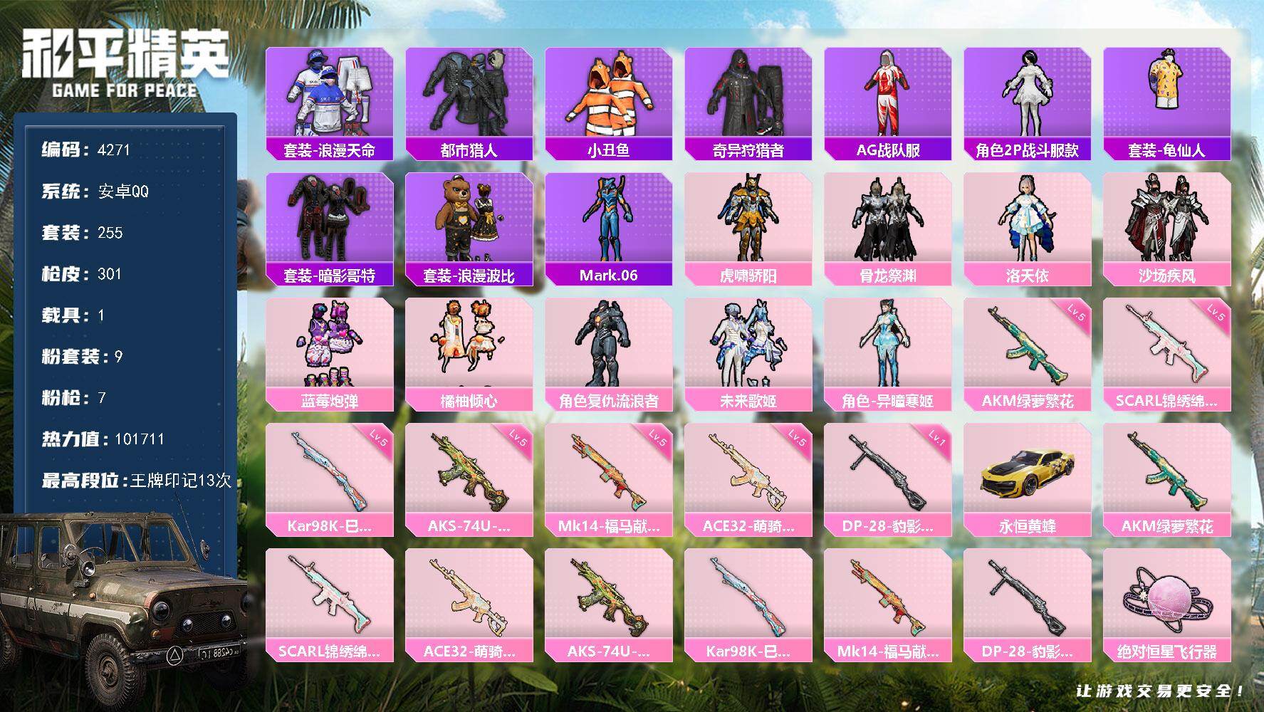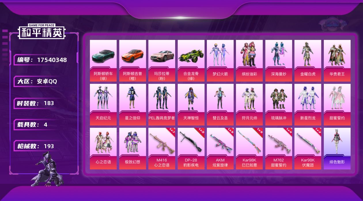 无敌战神框-1神装-12粉装-12特效枪-2载具-4粉色飞行器-71976热力值-16王牌印记-157套装-193枪皮