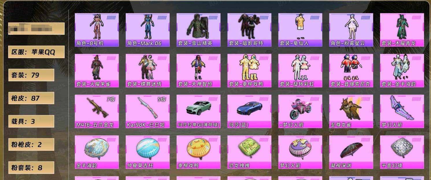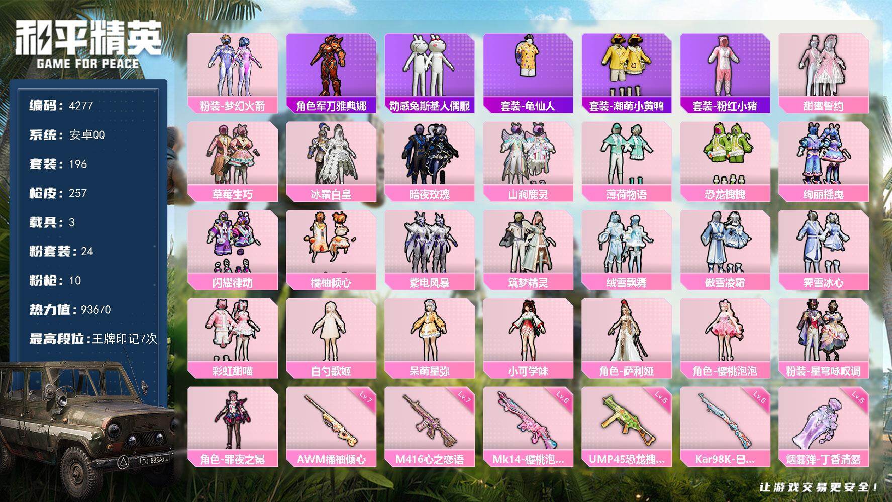24粉装-10特效枪-3载具-7粉色飞行器-93670热力值-7王牌印记-196套装-257枪皮