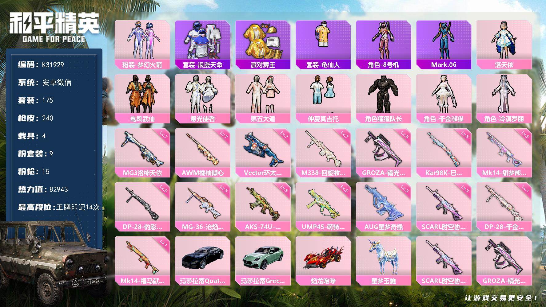 9粉装-15特效枪-4载具-4粉色飞行器-82943热力值-14王牌印记-175套装-240枪皮