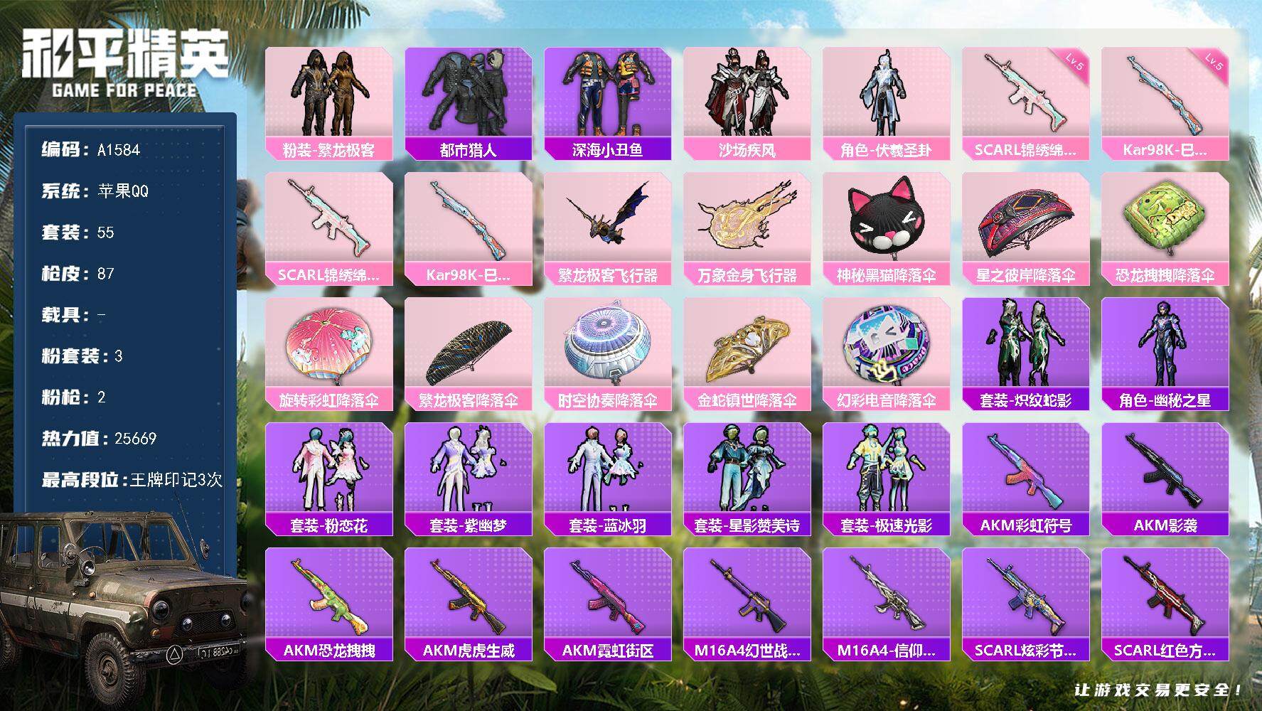 3粉装-2特效枪-0载具-2粉色飞行器-25669热力值-3王牌印记-55套装-87枪皮