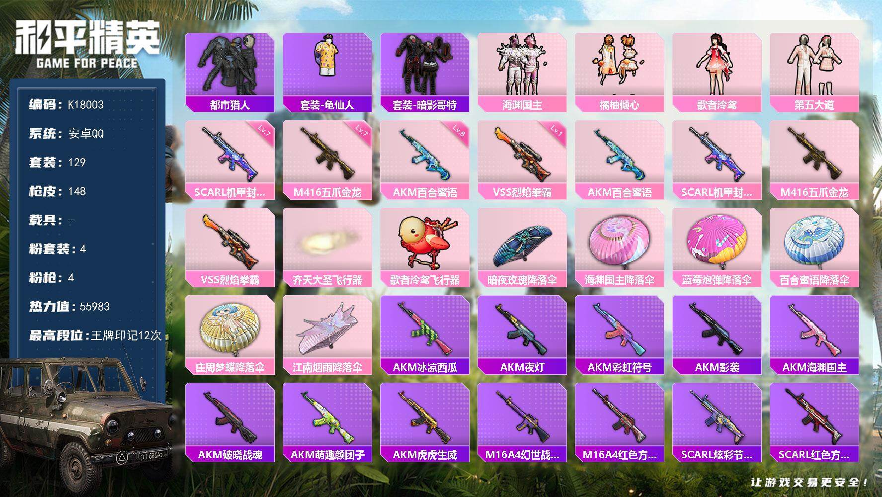 4粉装-4特效枪-0载具-2粉色飞行器-55983热力值-12王牌印记-129套装-148枪皮