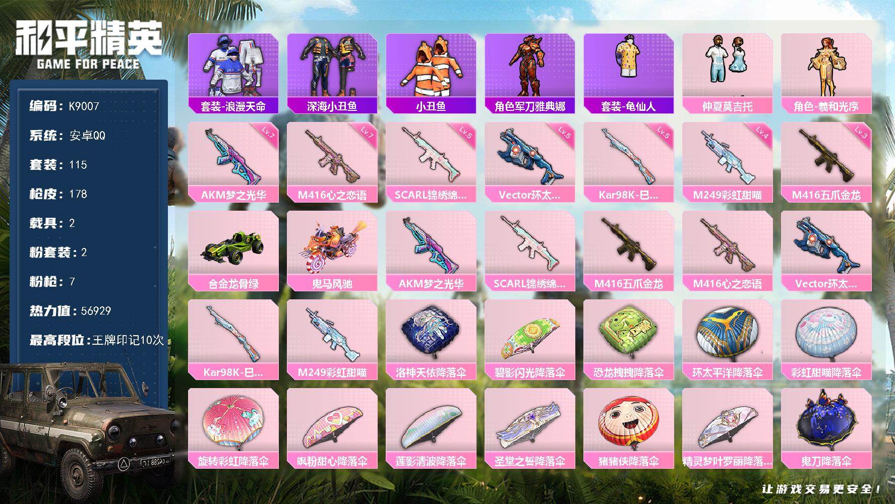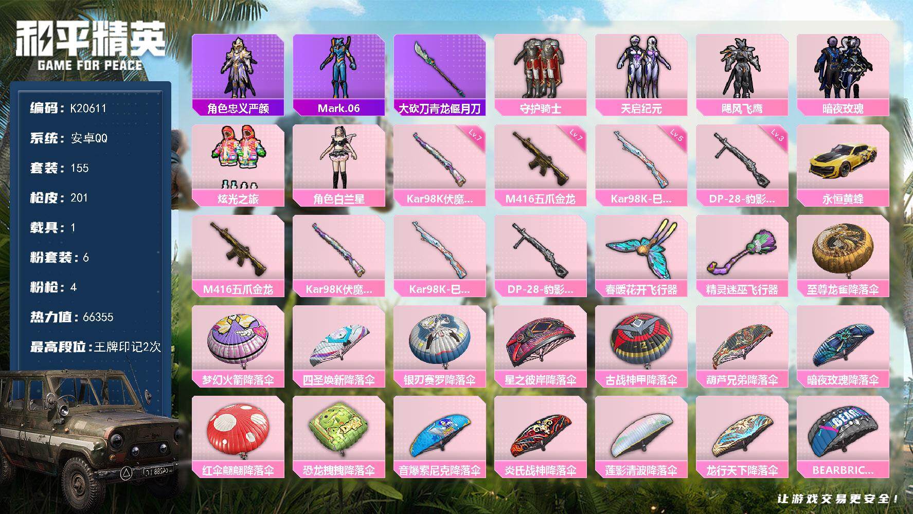 安卓 手Q-6粉装-4特效枪-1载具-2粉色飞行器-66355热力值-2王牌印记