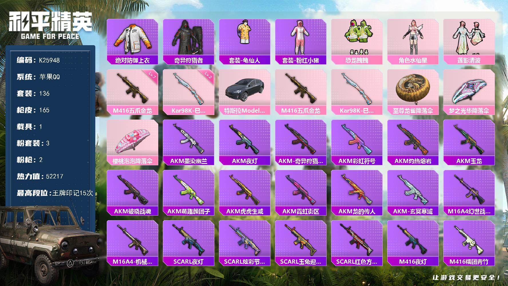 【紫螳螂13粉装8特效枪2载具素材号 秒换绑不用等】 安卓Q区-74266热力值