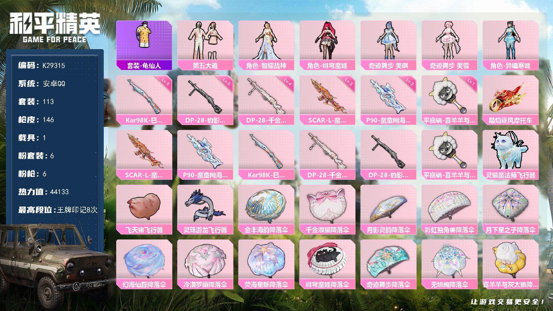 安卓 手Q-6粉装-6特效枪-1载具-3粉色飞行器-44133热力值-8王牌印记