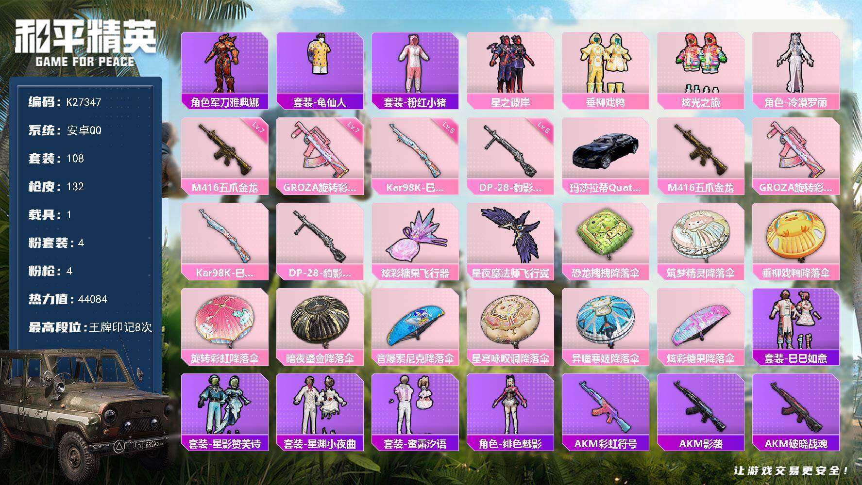 安卓 手Q-2粉装-7特效枪-0载具-1粉色飞行器-43057热力值-8王牌印记