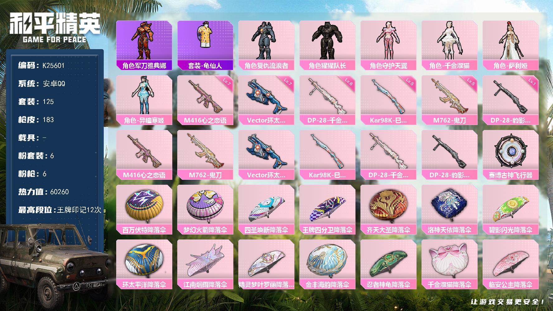 安卓 手Q-6粉装-6特效枪-0载具-1粉色飞行器-60260热力值-12王牌印