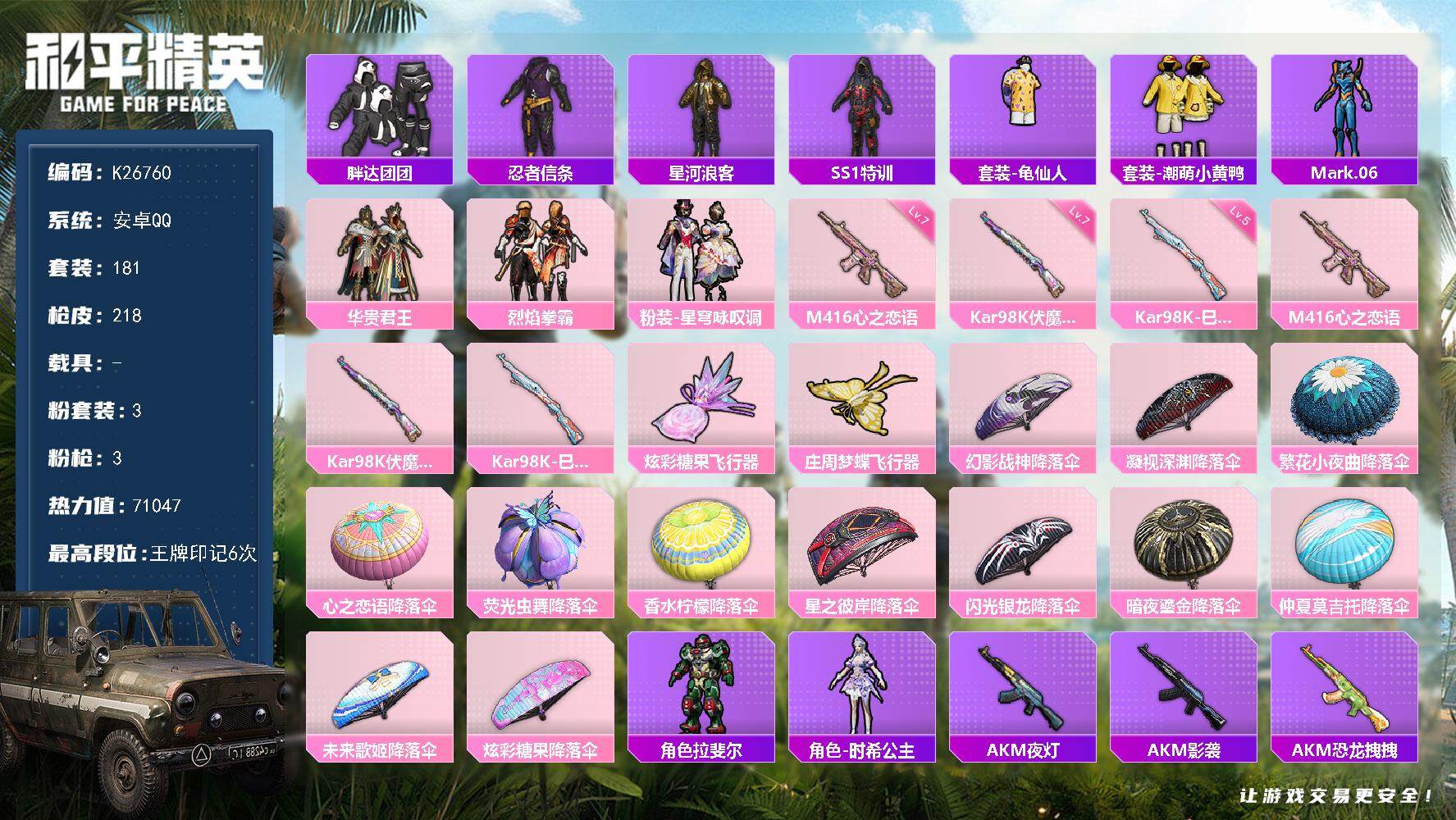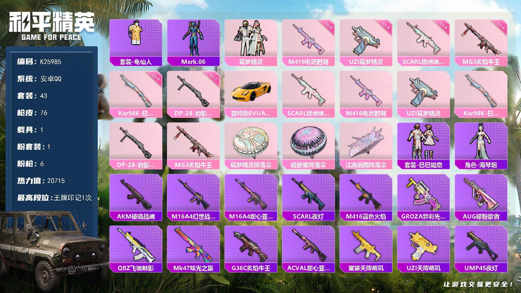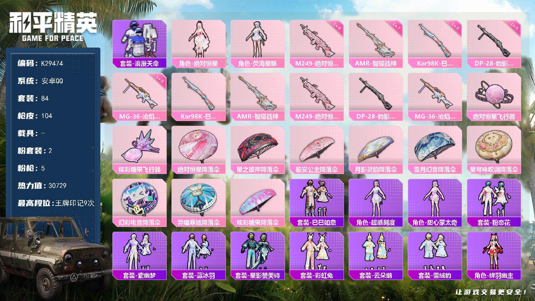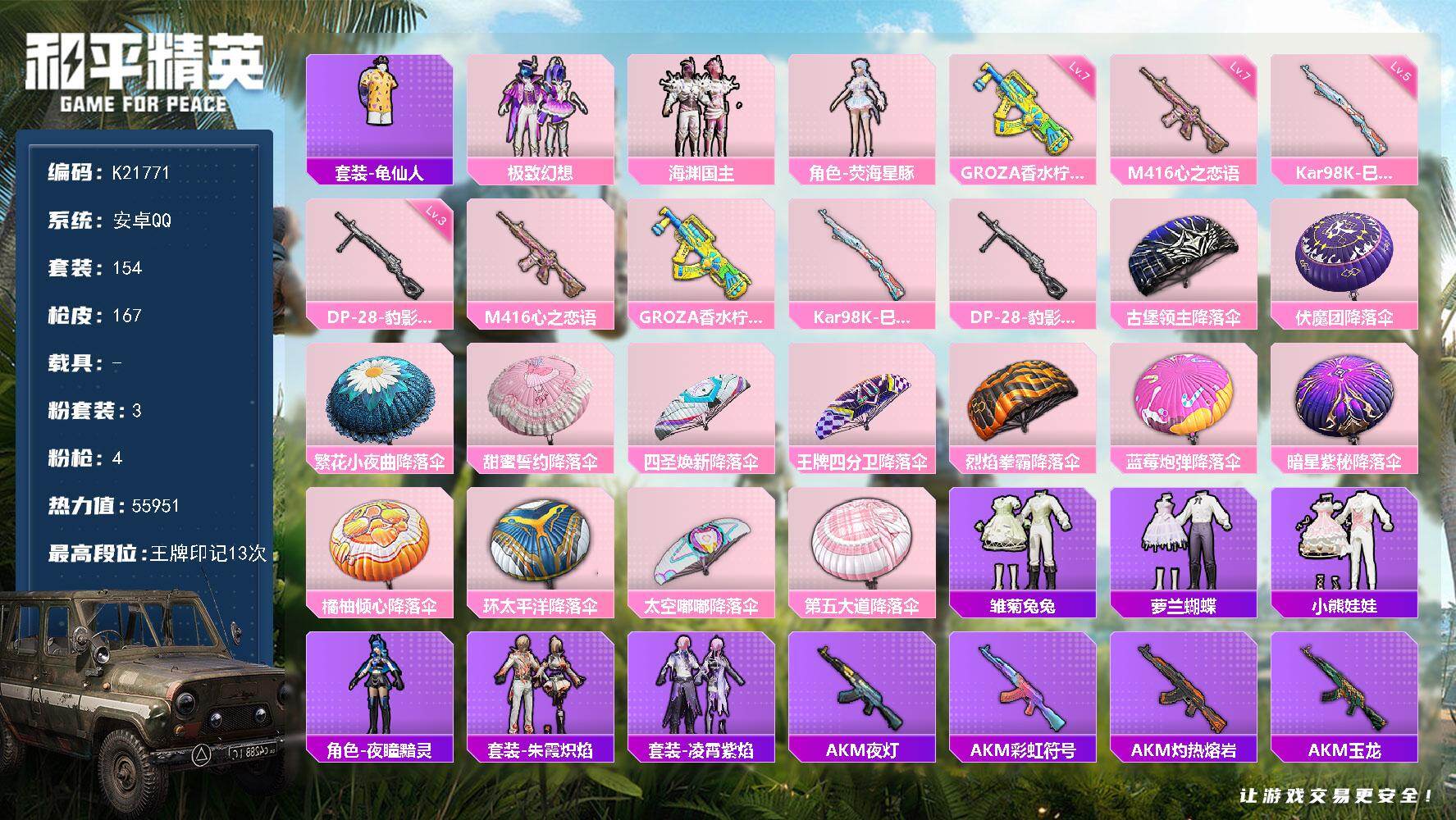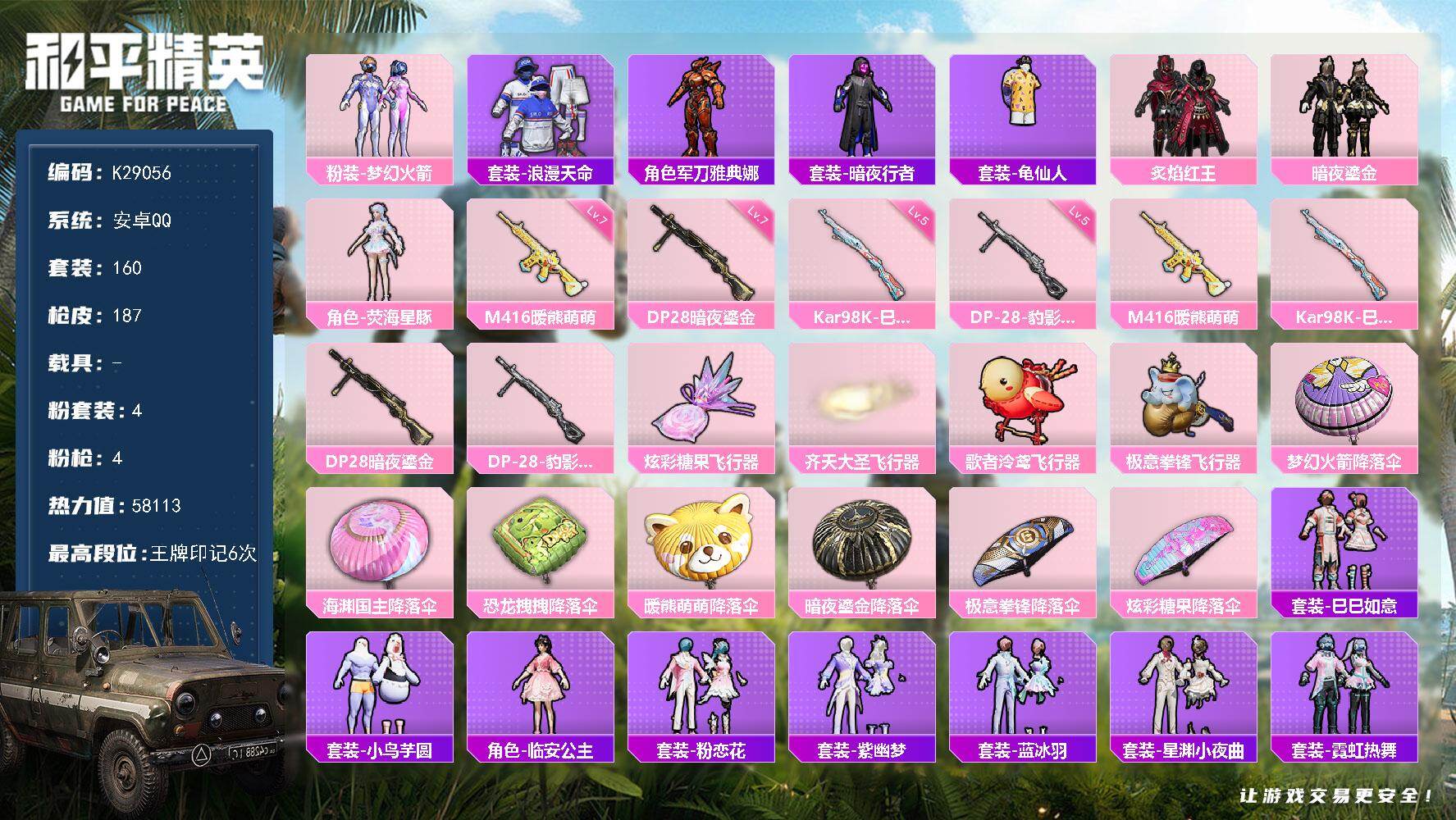 安卓 手Q-4粉装-4特效枪-0载具-4粉色飞行器-58113热力值-6王牌印记