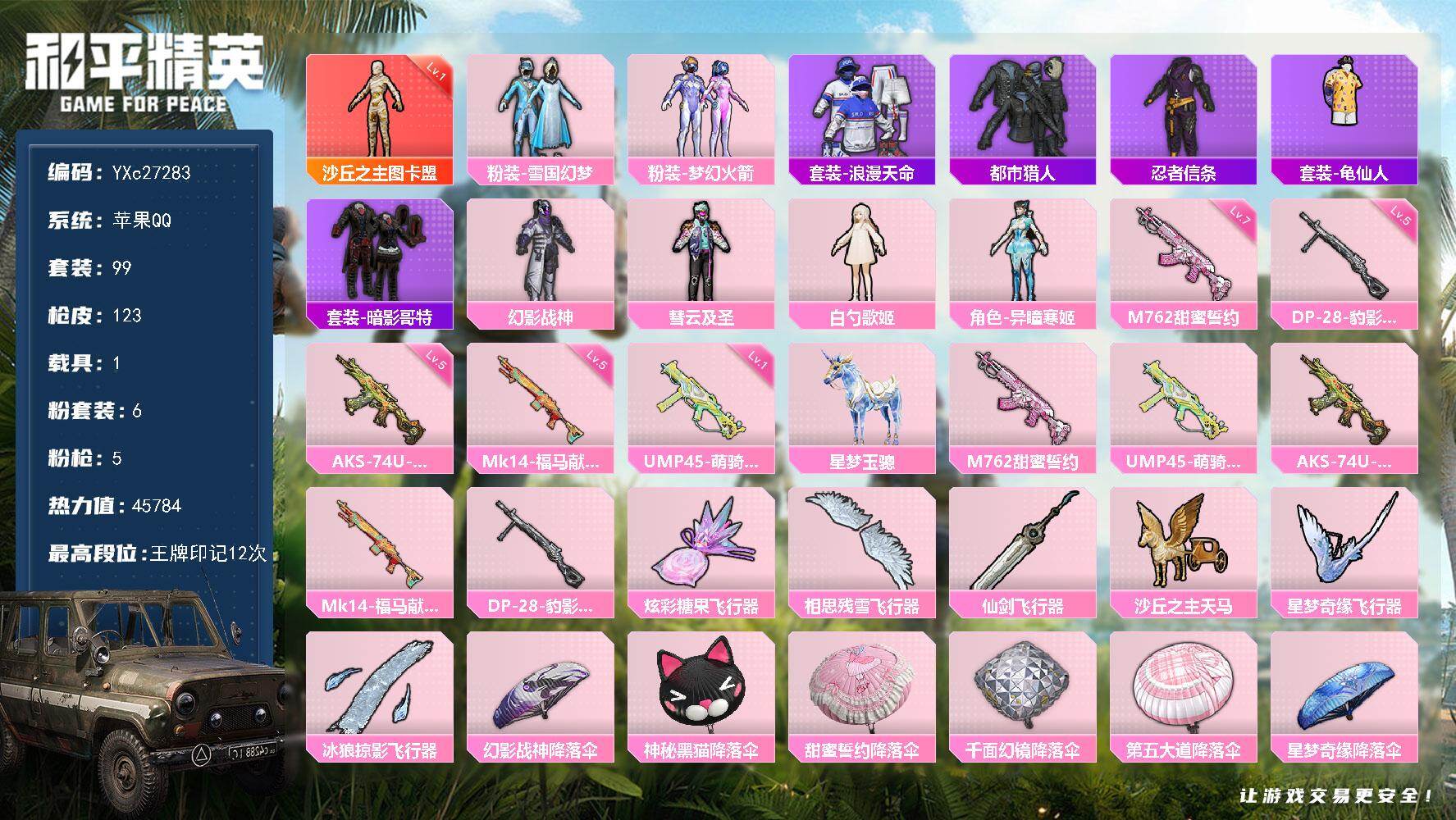 苹果 手Q-3粉装-3特效枪-0载具-2粉色飞行器-47395热力值-5王牌印记