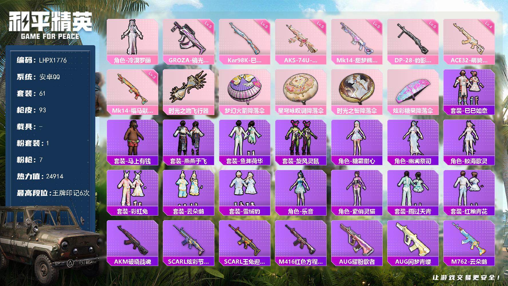 安卓 手Q-4粉装-6特效枪-0载具-1粉色飞行器-38832热力值-3王牌印