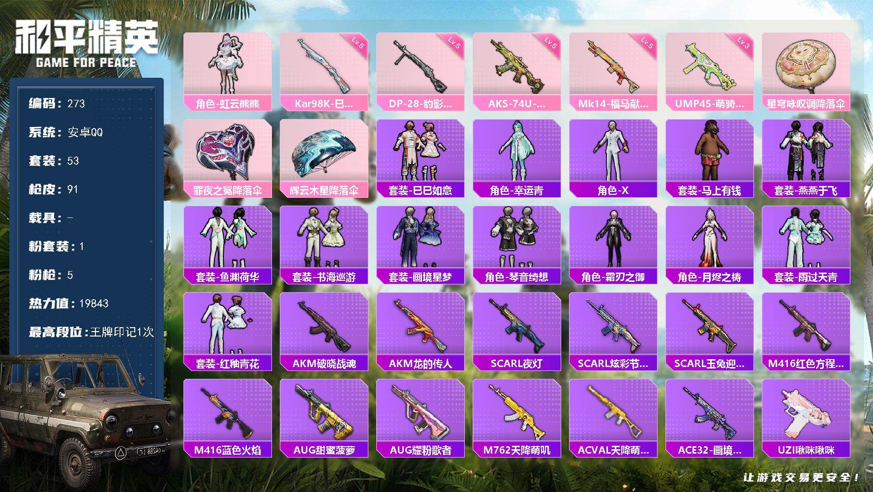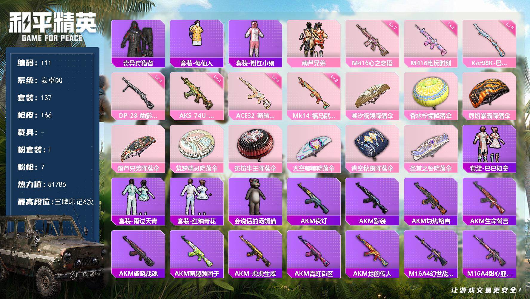 安卓 手Q-2粉装-5特效枪-0载具-2粉色飞行器-54965热力值-10王牌
