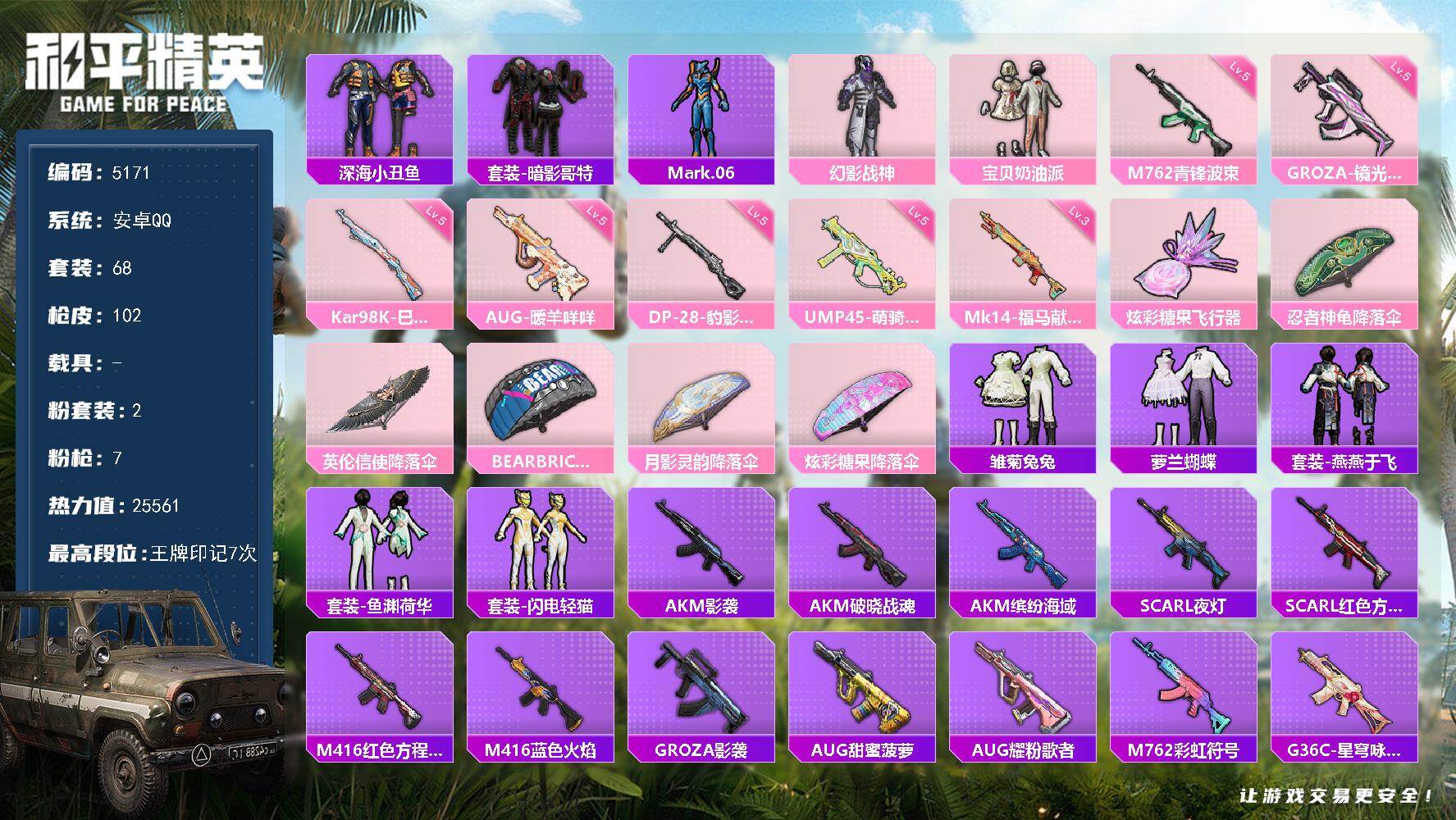 可二次【1载具1粉装1特效枪 秒换绑不用等】 安卓Q区-10987热力值-37套