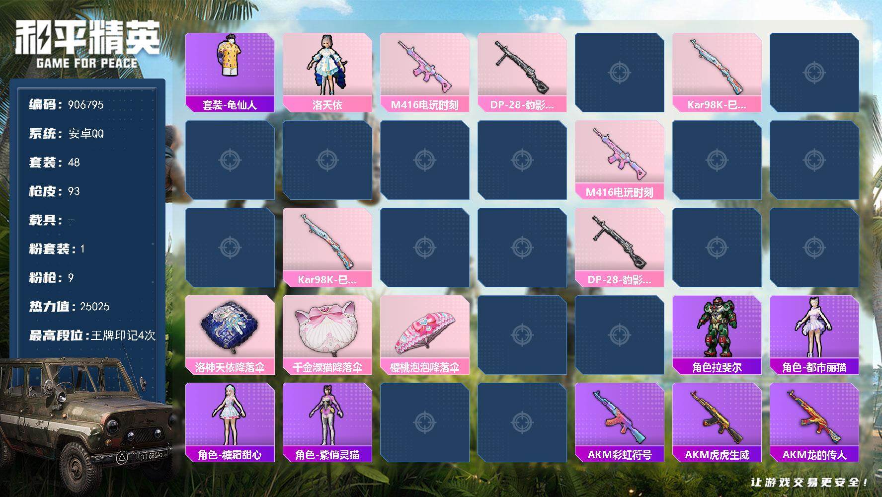 可二次【1载具1粉装1特效枪 秒换绑不用等】 安卓Q区-10987热力值-37套