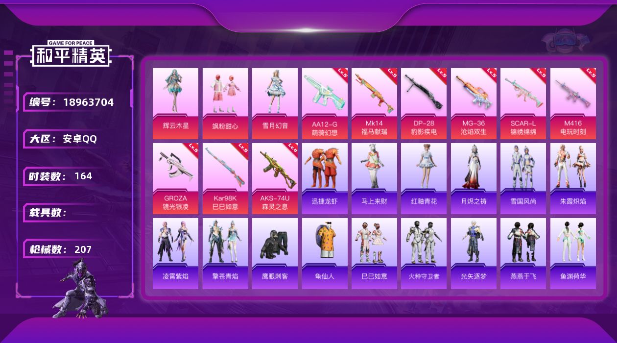 hs60241 安卓手Q-2王牌印记-2粉装-4特效枪-1载具-39248热力值-113套装-117